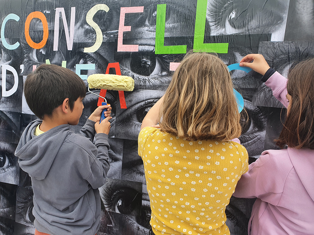 A partir d’aquí, es van crear quatre comissions de treball: celebració, relacionada amb el cicle festiu; veu, que ha treballat propostes relacionades amb la música, la literatura i la poesia; cos, vinculada a la dansa i el teatre; i espai, que ha ideat projectes relacionats amb les arts plàstiques, la fotografia i el land-art. Una de les idees compartides per tots els conseller si conselleres era fer un mural artístic en algun espai públic del municipi. En aquest sentit, es va incorporar al projecte a l’artista Beatriz del Campo, que durant tres sessions va fer fotos dels ulls dels nens i nenes, que han servit per realitzar un mural efímer, de paper, que aquesta setmana els infants han creat a l’aparcament de les Hortes. Juan Jurado ha apunta que “el Consell vol reconèixer els infants com a ciutadans i ciutadanes i donar valor a la seva veu i mirada en les decisions de la nostra comunitat, el mural visibilitza aquesta mirada dels nens i nenes sobre Esparreguera”.