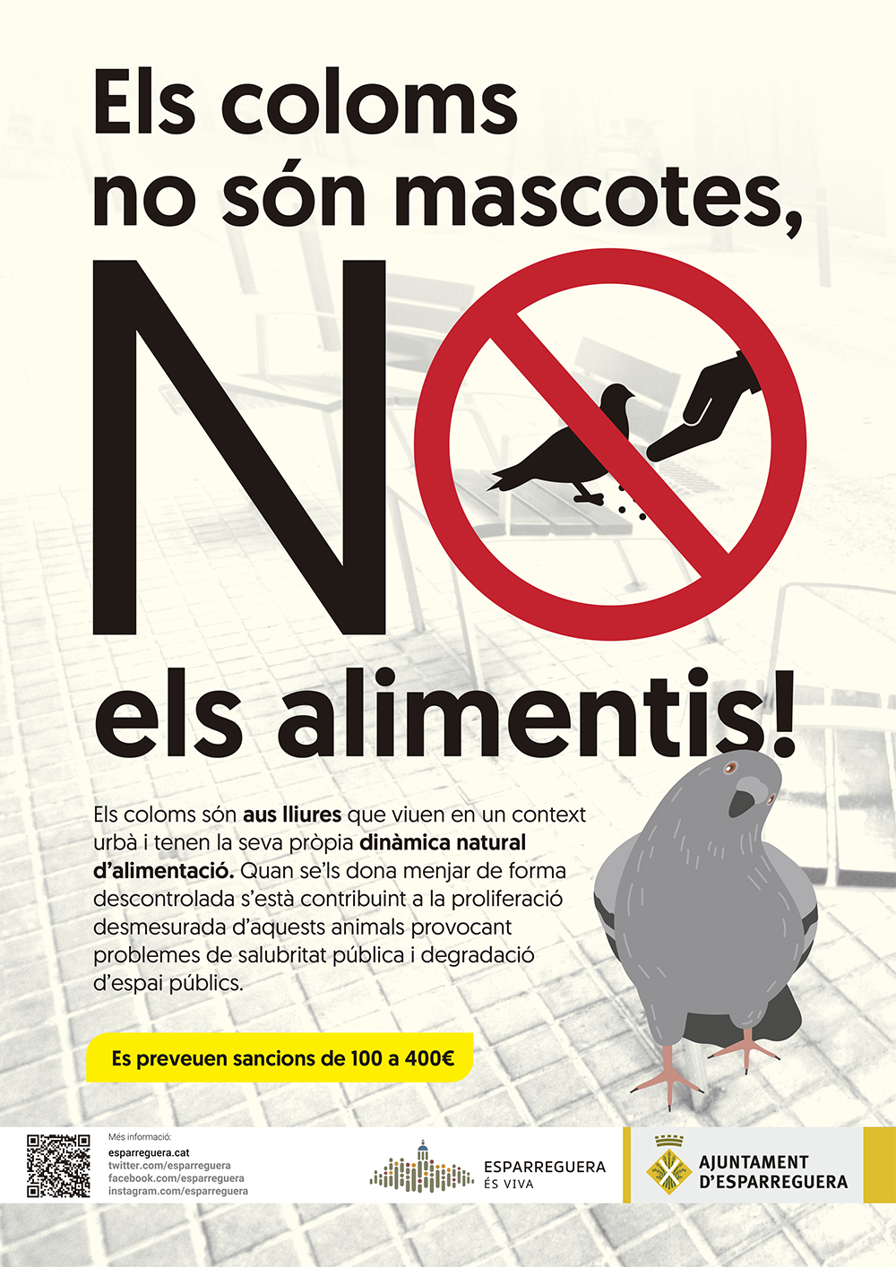La Regidoria de Salut Pública inicia aquest mes de juny una campanya per a controlar la reproducció dels coloms i reduir les afectacions que generen els amuntegaments o les colònies d’aquestes aus. Sota el lema “Els coloms no són mascotes, no els alimentis!”, es convida la ciutadania a reflexionar sobre el fet de donar menjar als coloms i s’informa dels problemes que aquesta acció comporta. La campanya de conscienciació forma part d’un conjunt d’actuacions que porta a terme la regidoria per a controlar la proliferació d’aquest animal. L’empresa gestora de control de plagues de l’Ajuntament està elaborant un estudi per a detectar les colònies de coloms i determinar quins mecanismes dissuasius utilitzar per a minimitzar les molèsties. La campanya s’acompanya amb una difusió específica en aquelles ubicacions on s’ha detectat una major presència de coloms per l’accés ràpid al menjar, com són els establiments de restauració que tenen terrasses en l’espai públic. En aquest sentit, també s’ha obert la campanya als establiments del municipi perquè ajudin a transmetre la importància de no subministrar aliments als coloms. L’Ajuntament també recorda que l’actual normativa considera aquesta acció com a falta lleu i preveu sancions de 100 a 400 euros.