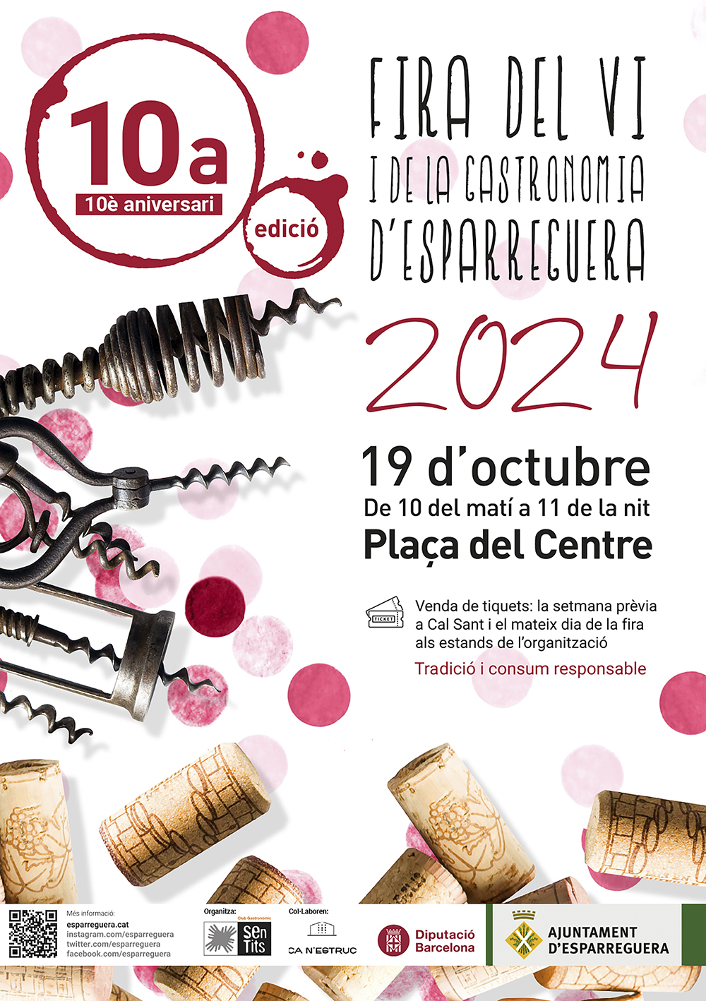 El dissabte 19 d'octubre torna la Fira del vi i la gastronomia d'Esparreguera que enguany celebra el seu 10è aniversari. La fira tindrà lloc a la plaça del Centre, de 10 a 23 h, i compta amb restauradors del municipi i cellers del territori.