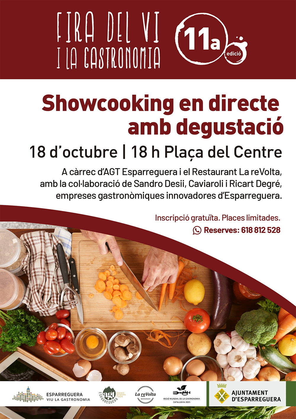 En el marc de l'11a edició de la Fira del Vi i la Gastronomia d'Esparreguera, el 18 d'octubre a les 18 h hi haurà una demostració de cuina en directe amb degustació a càrrec de l'Associació Gastronomia i Turisme d'Esparreguera i el Restaurant La Revolta, amb la col·laboració de Sandro Desii, Caviaroli i Ricart Degré, empreses gastronòmiques innovadores d’Esparreguera.