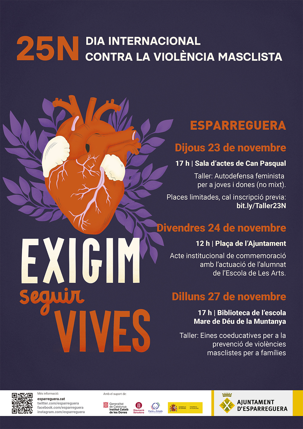 En el marc del 25N, Dia Internacional per a l'Eliminació de la Violència envers les Dones, el divendres 24 de novembre a les 12 h, a la plaça de l'Ajuntament, hi haurà l'acte institucional per a l'eliminació de la violència envers les dones, amb la lectura del manifest i una actuació de l'alumnat de l'Escola de Les Arts.