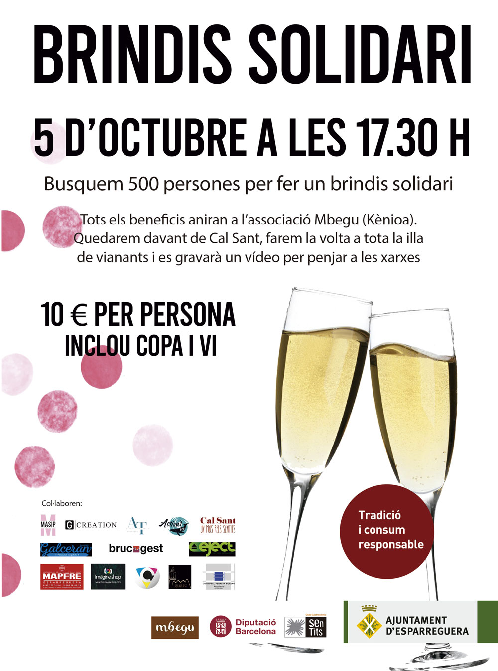 Es busquen 500 persones per fer un brindis solidari, a benefici de l'Associació Mbegu de Kènia. La trobada serà davant de Cal Sant, es farà una volta a tota l'illa de vianants, i es gravarà un vídeo per a penjar a les xarxes socials.