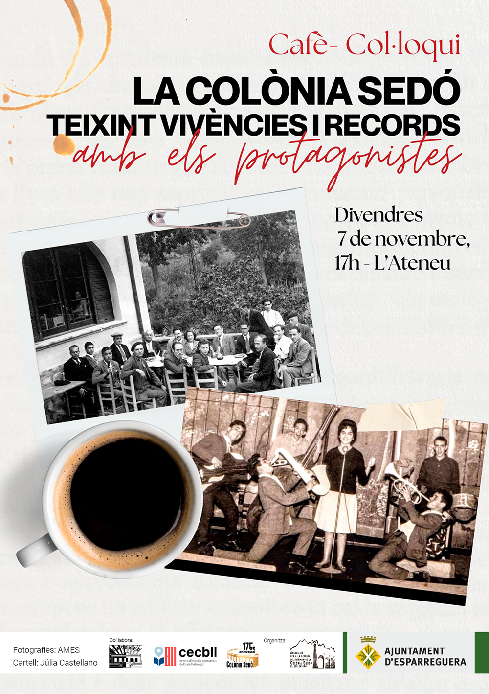 L'Associació per la defensa del patrimoni de la Colònia Sedó i el seu entorn, juntament amb l'Ajuntament d'Esparreguera, organitza divendres 7 de novembre el cafè-col·loqui "La Colònia Sedó teixint vivències i records" amb els protagonistes de les fotografies de l'exposició que s'ha fet en motiu del 175è aniversari de l'inici de l'activitat industrial a la colònia.