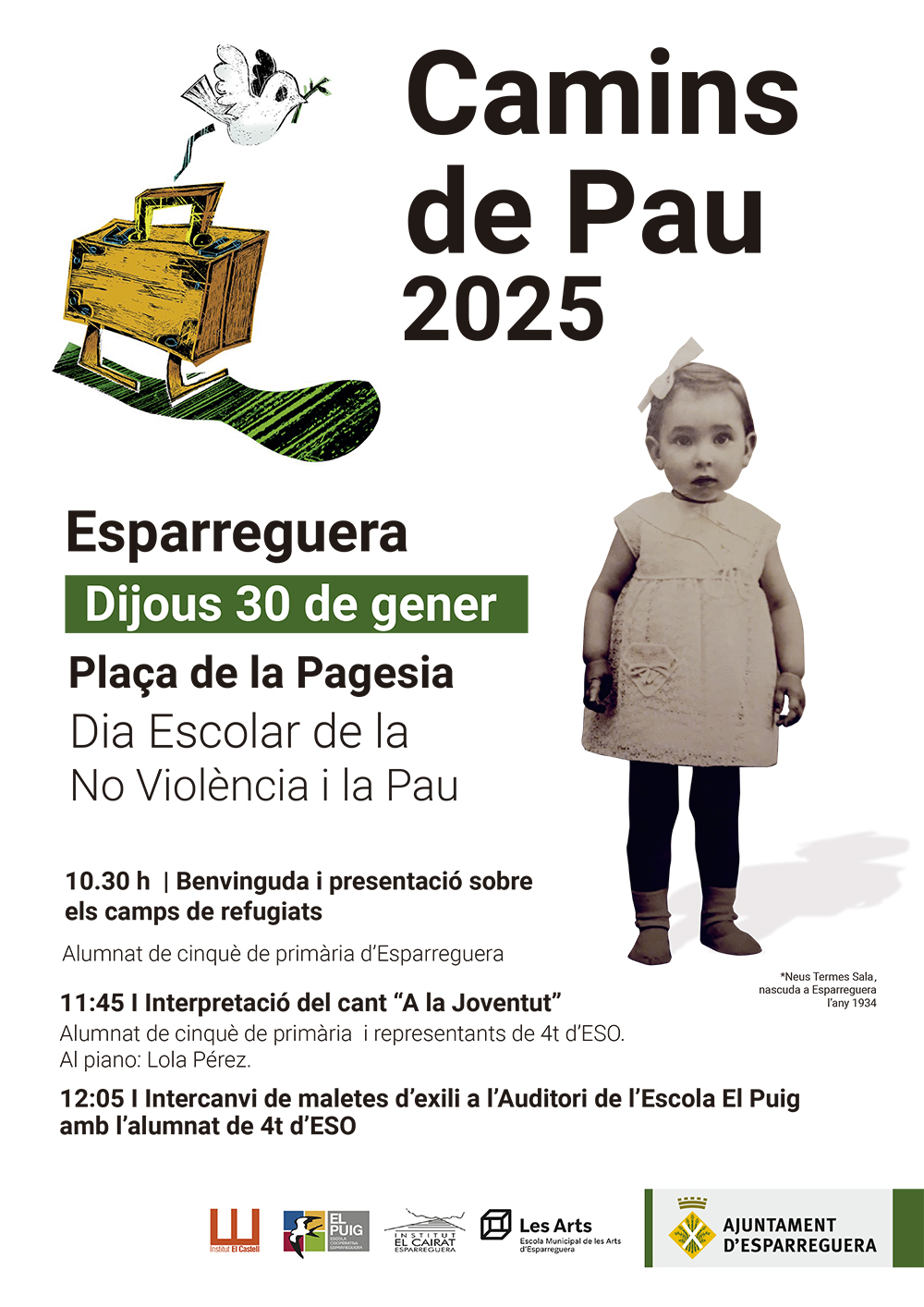 10.30 h Actes escolars amb motiu del Dia Internacional Escolar de la No Violència i la Pau a la plaça de la Pagesia. Benvinguda i presentació dels treballs sobre els camps de refugiats i l'exili per part de l’alumnat de 5è de primària de les escoles d'Esparreguera.