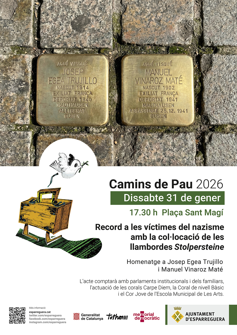 En el marc del projecte Camins de Pau, el dissabte 31 de gener a les 17.30h de la tarda tindrà lloc un acte de record a les víctimes del nazisme amb la col·locació de dues llambordes Stolpersteine en memòria de Josep Egea Trujillo (carrer Ferran Puig, 89) i Manuel Vinaroz Maté (carrer Bruc, 14).