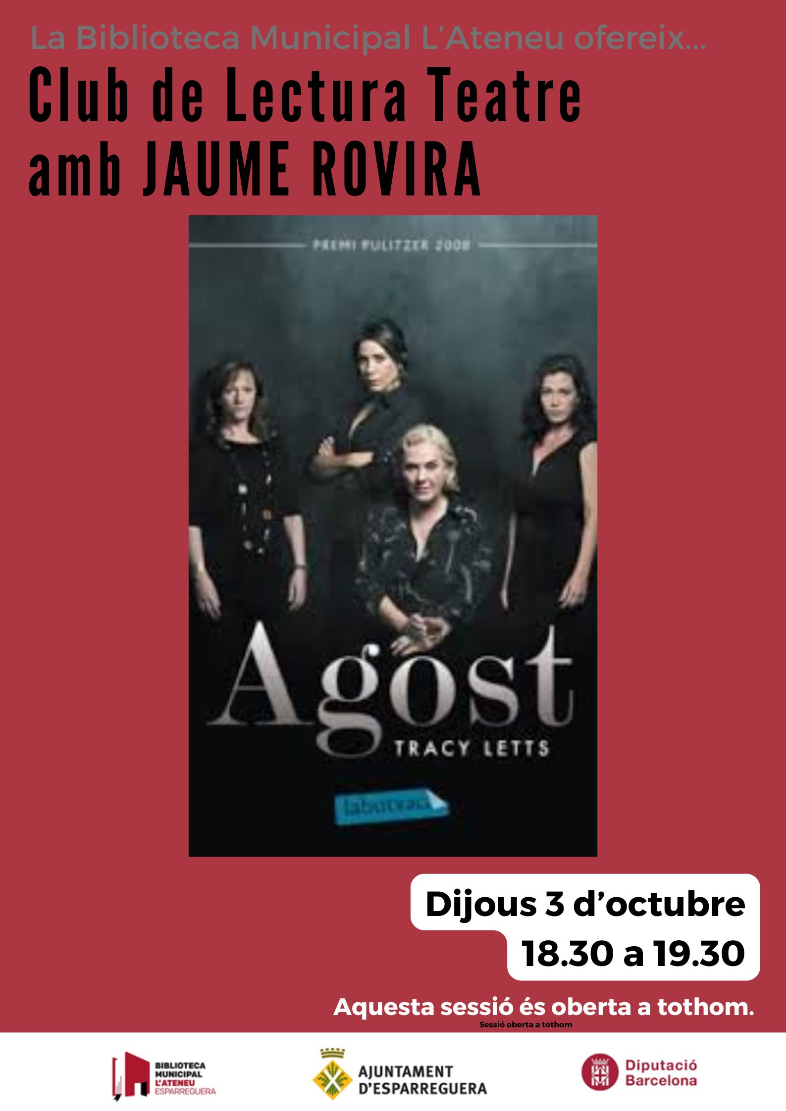 El Club de Lectura de Teatre estrena temporada amb una sessió especial oberta a tothom dedicada a l'obra "Agost", de Tracy Letts. Hi participarà Jaume Rovira, director de l'obra que es representa a la Passió d'Esparreguera durant el mes de setembre.