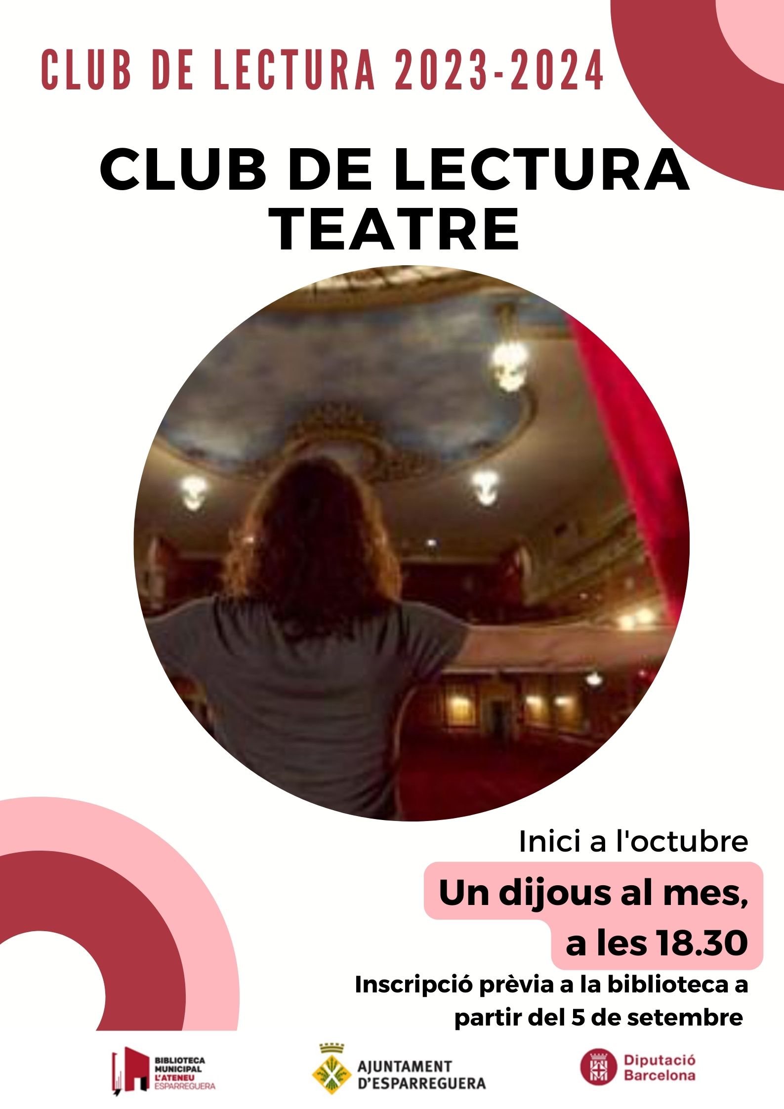 A la biblioteca "llegim el teatre" al club de lectura mensual dedicat a aquest art. Les trobades tenen lloc un dijous al mes de 18.30 a 19.30 h a la Sala d'Actes.