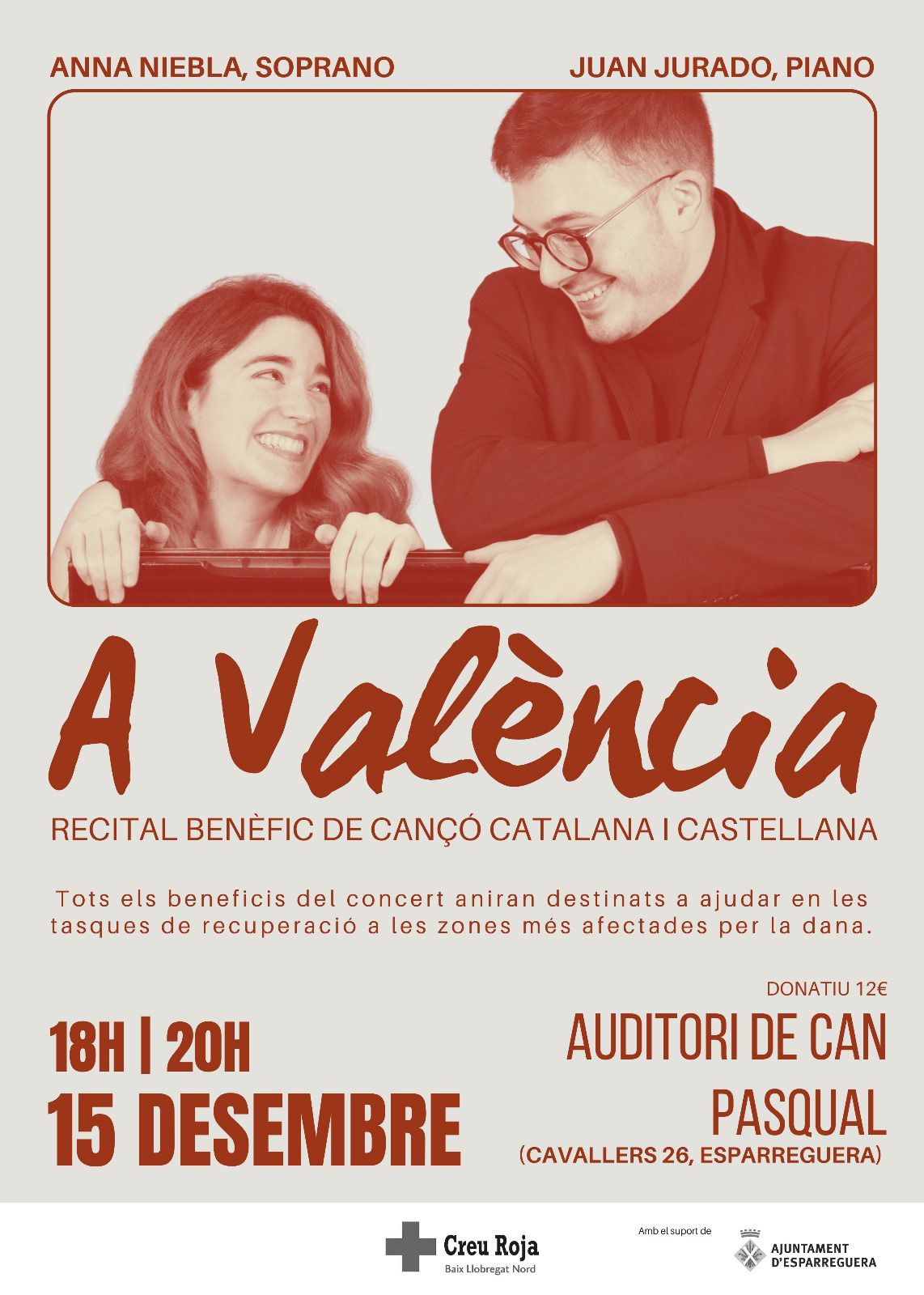 El 15 de desembre a les 18 h tindrà lloc a l'Auditori de Can Pasqual, el recital benèfic de cançó catalana i castellana, A València. El concert anirà a càrrec d'Anna Niebla, soprano, i Juan Jurado, piano, i tots els beneficis es destinaran a ajudar en les tasques de recuperació de les zones més afectades per la catàstrofe de la DANA.