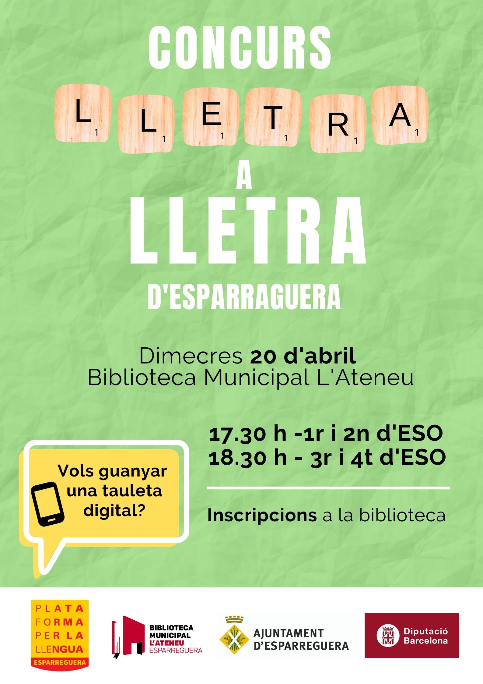Enguany celebrem la vuitena edició del Concurs “Lletra a Lletra” per a estudiants d’ESO, amb la Plataforma per la Llengua. El concurs consisteix en lletrejar correctament un seguit de paraules proposades, en diverses rondes, amb l’objectiu de fomentar l’interès per la llengua a través del joc.