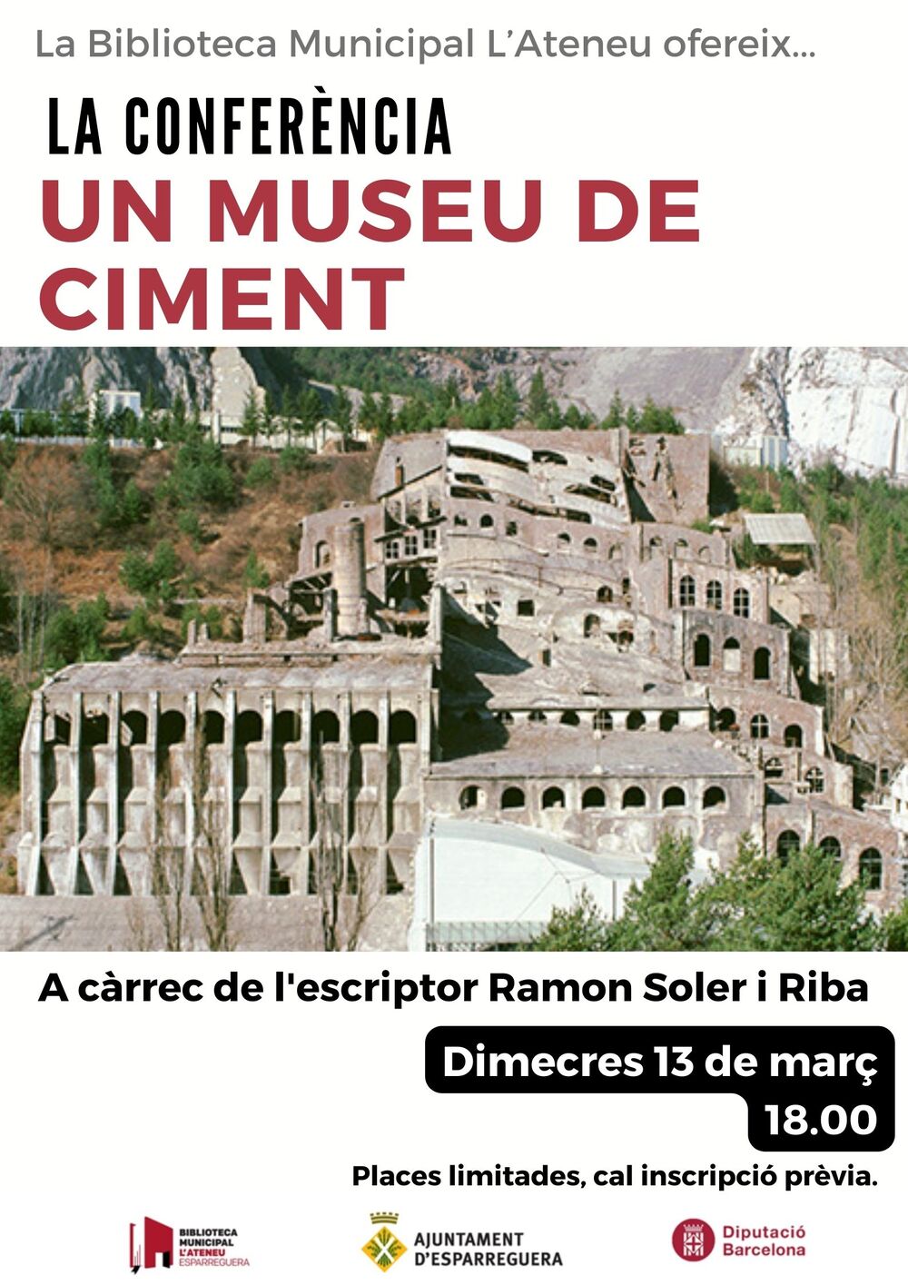 El dimecres 13 de març a les 18:00 hores, a la Sala d'actes de la Biblioteca, l'escriptor Ramon Soler oferirà la conferència "Un museu de ciment".