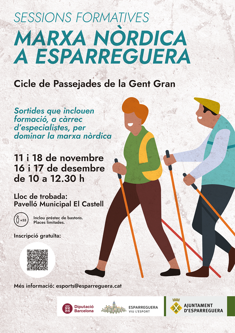 El Servei d'Esports municipal organitza una formació gratuïta de marxa nòrdica adreçada a persones majors de 55 anys. El taller teoricopràctic, d'una durada de dues hores i mitja, s'emmarca dins del Cicle de Passejades de la Gent Gran de la Diputació de Barcelona i se centra a millorar la tècnica correcta de la marxa nòrdica de forma personalitzada.
