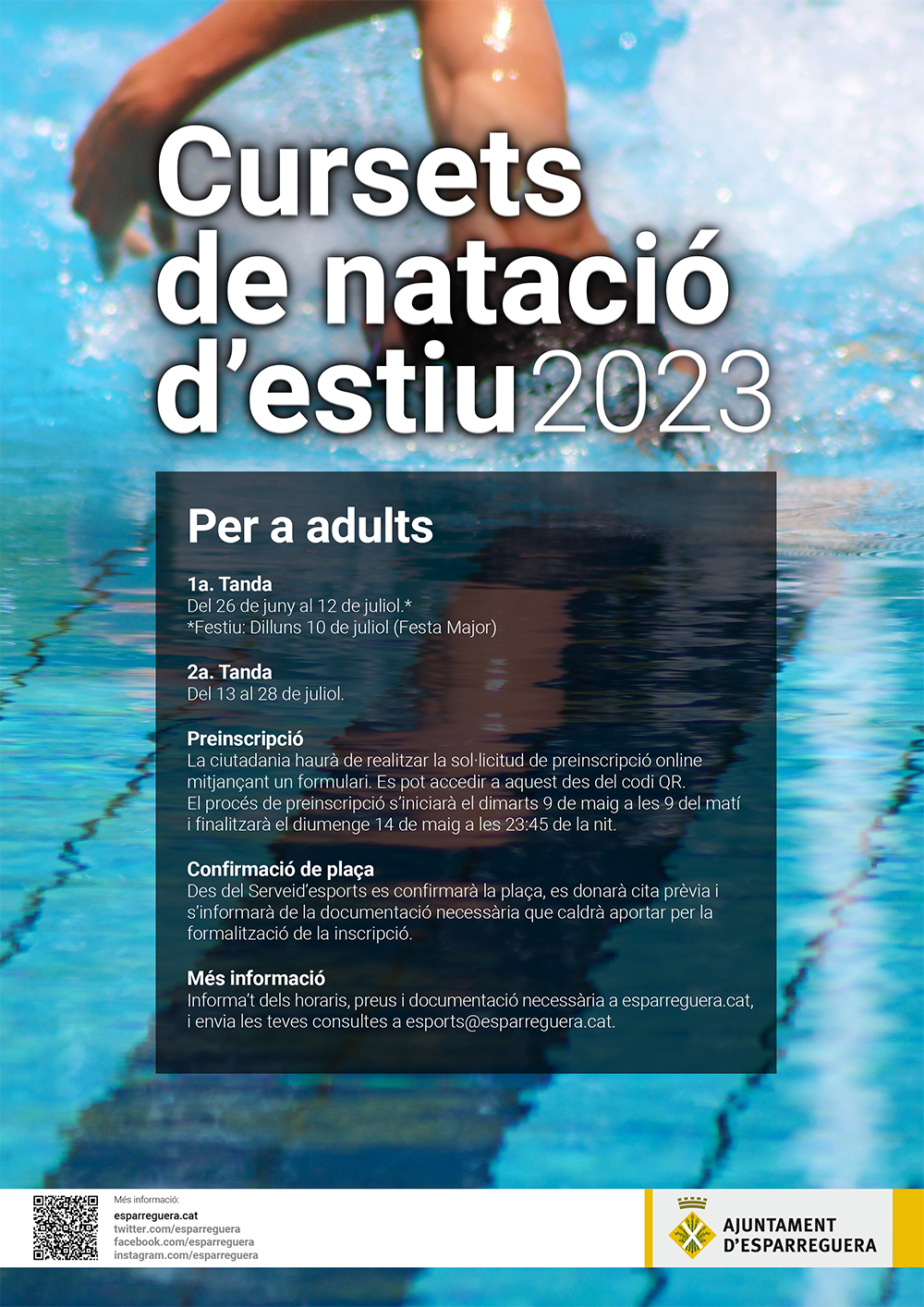 El Servei d'Esports de l'Ajuntament d'Esparreguera organitza cursets de natació per a adults que encara no s'han decidit a aprendre a nedar o volen millorar el seu nivell ho facin durant l’estiu de forma intensiva.