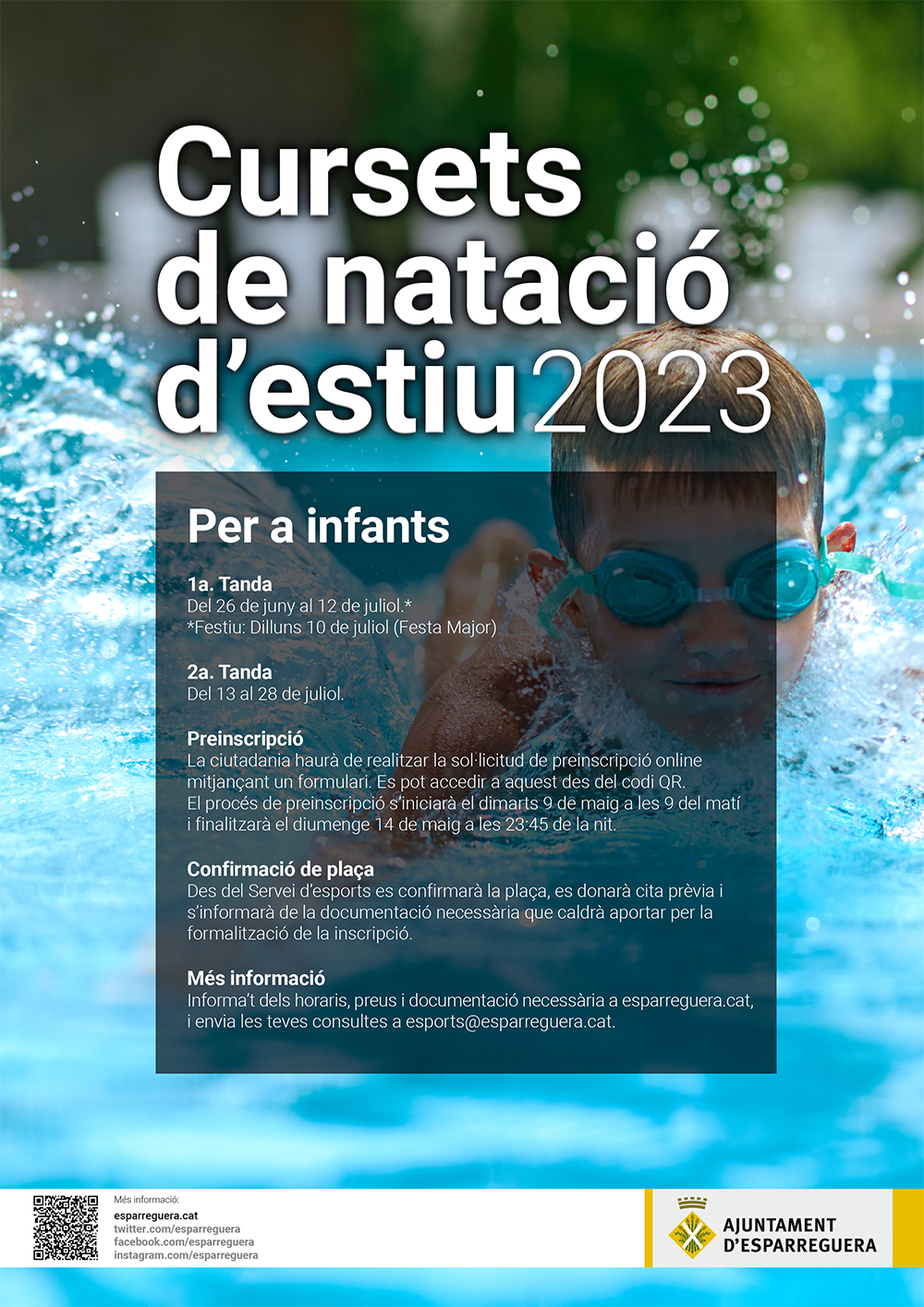 El Servei d'Esports de l'Ajuntament d'Esparreguera organitza els cursets de natació intensius per a infants nascuts entre els anys 2009 i 2020.