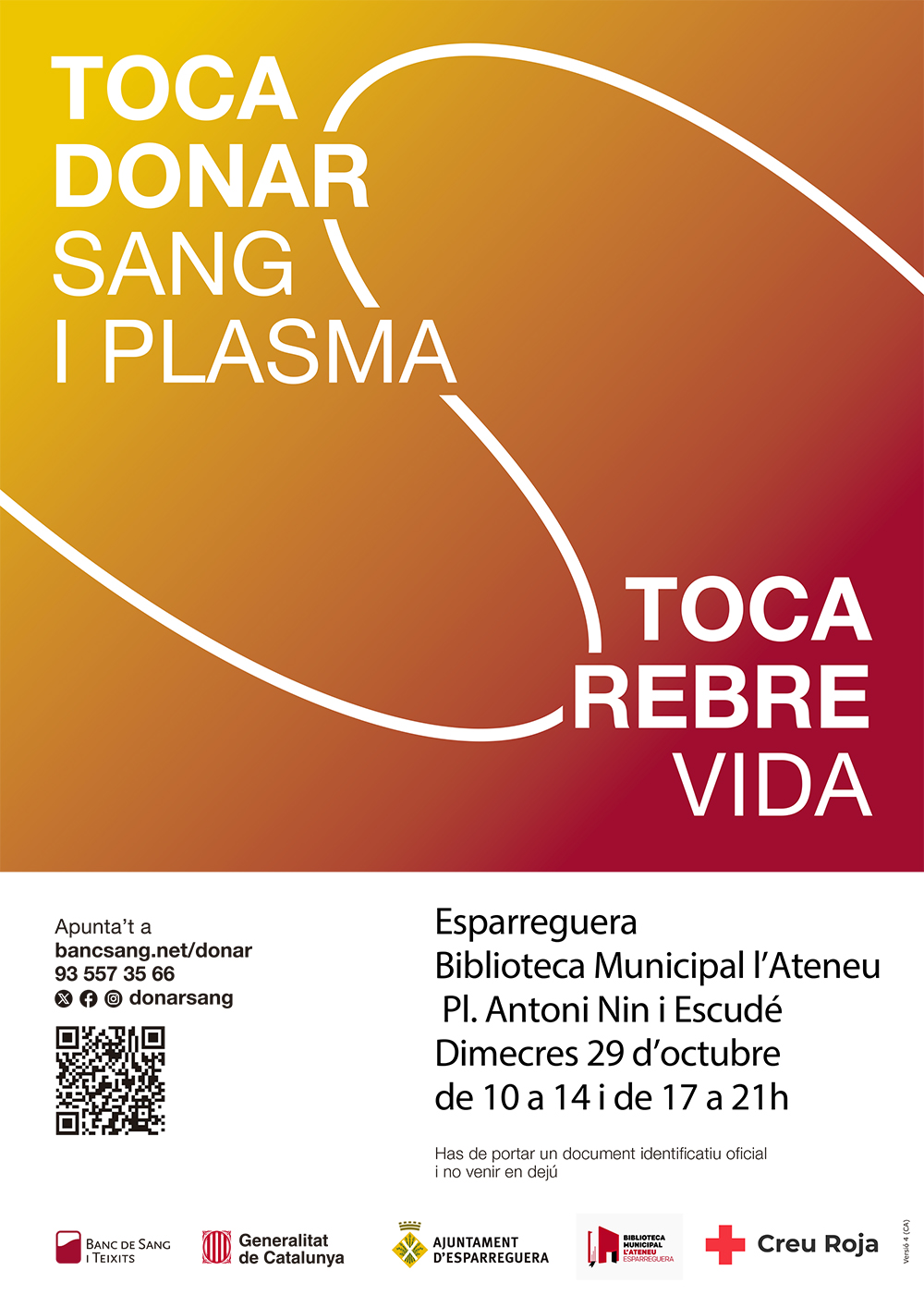 El Banc de Sang i Teixits de Catalunya instal·larà un centre de donació de sang i plasma a la Biblioteca Municipal l'Ateneu el dimecres 29 d'octubre a la Biblioteca Municipal L'Ateneu.