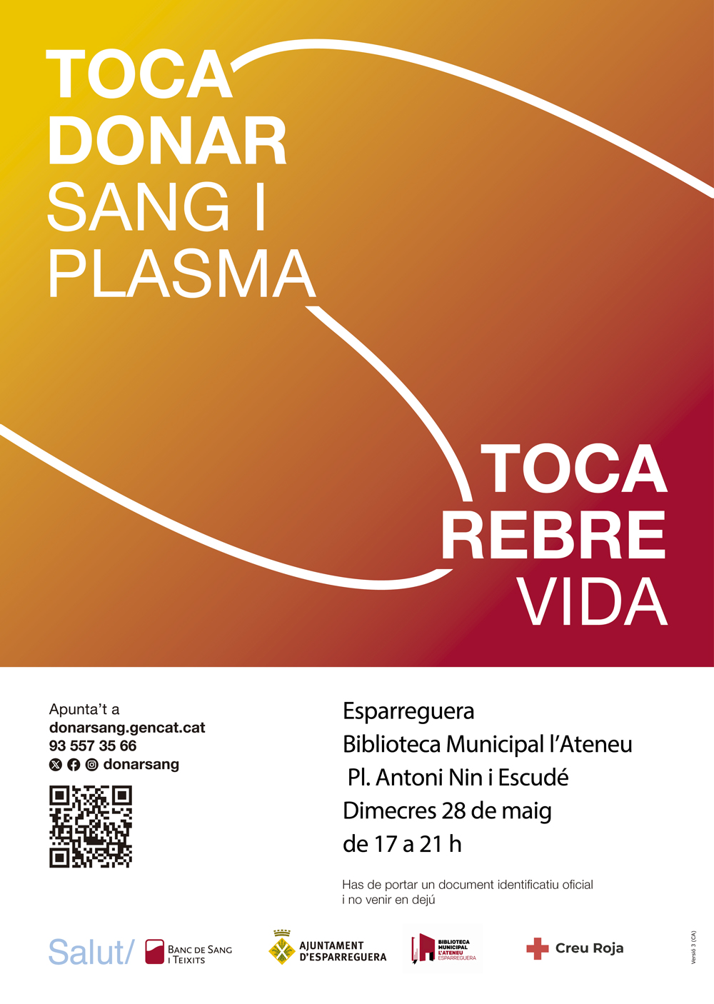 El Banc de Sang i Teixits de Catalunya instal·larà un centre de donació de sang i plasma a la Biblioteca Municipal l'Ateneu el dimecres 28 de maig a la Biblioteca Municipal L'Ateneu.