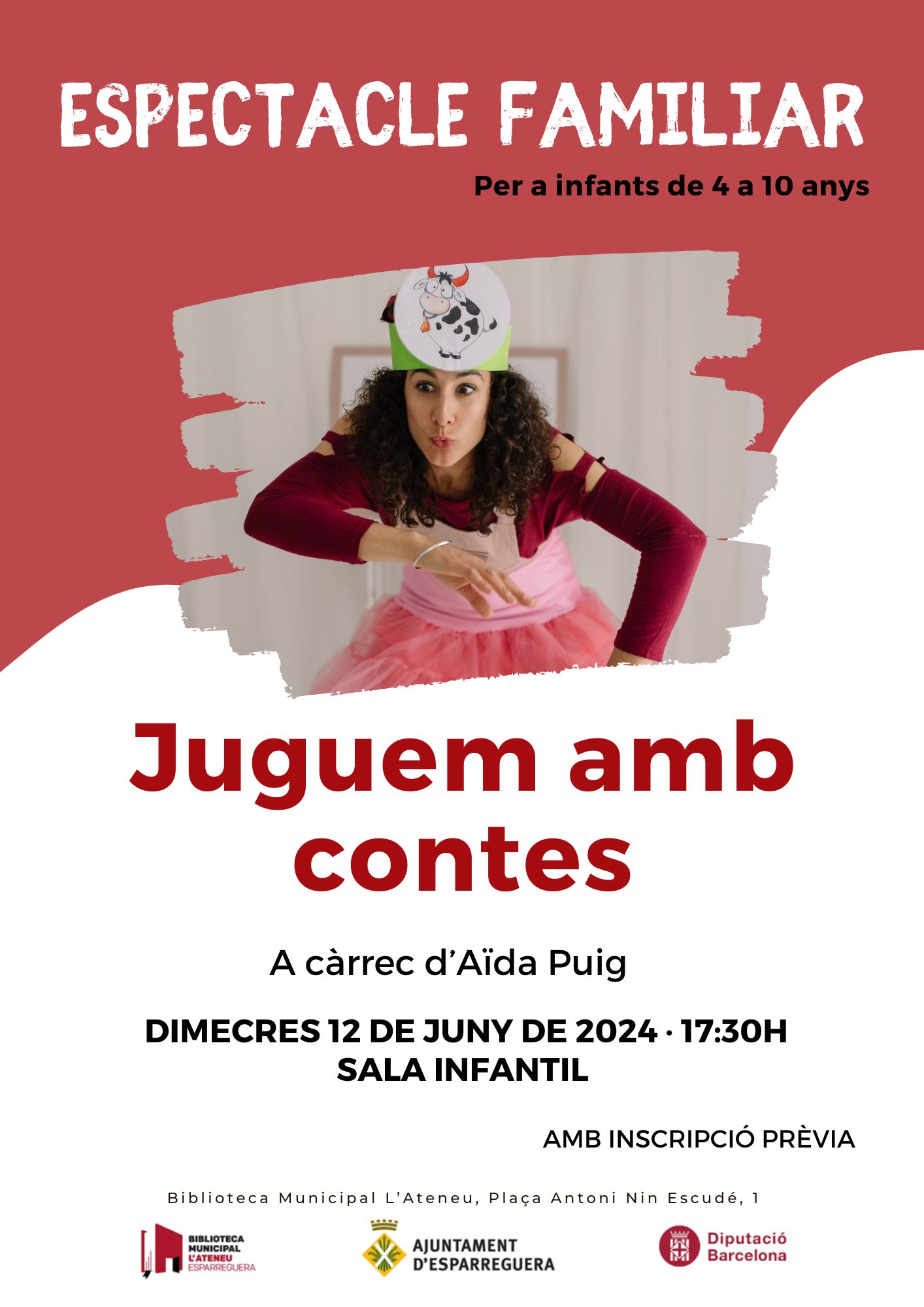 Al juny la Biblioteca ofereix un nou espectacle familiar per a infants de 4 a 10 anys. Serà "Juguem amb contes", a càrrec de l'Aïda Puig, amb qui coneixerem els germans Joan i la Laura i tot el que troben al rebost de la masia dels avis, que és ple de disfresses, contes i històries. L'activitat tindrà lloc el dimecres 12 de juny a les 17.30 hores.