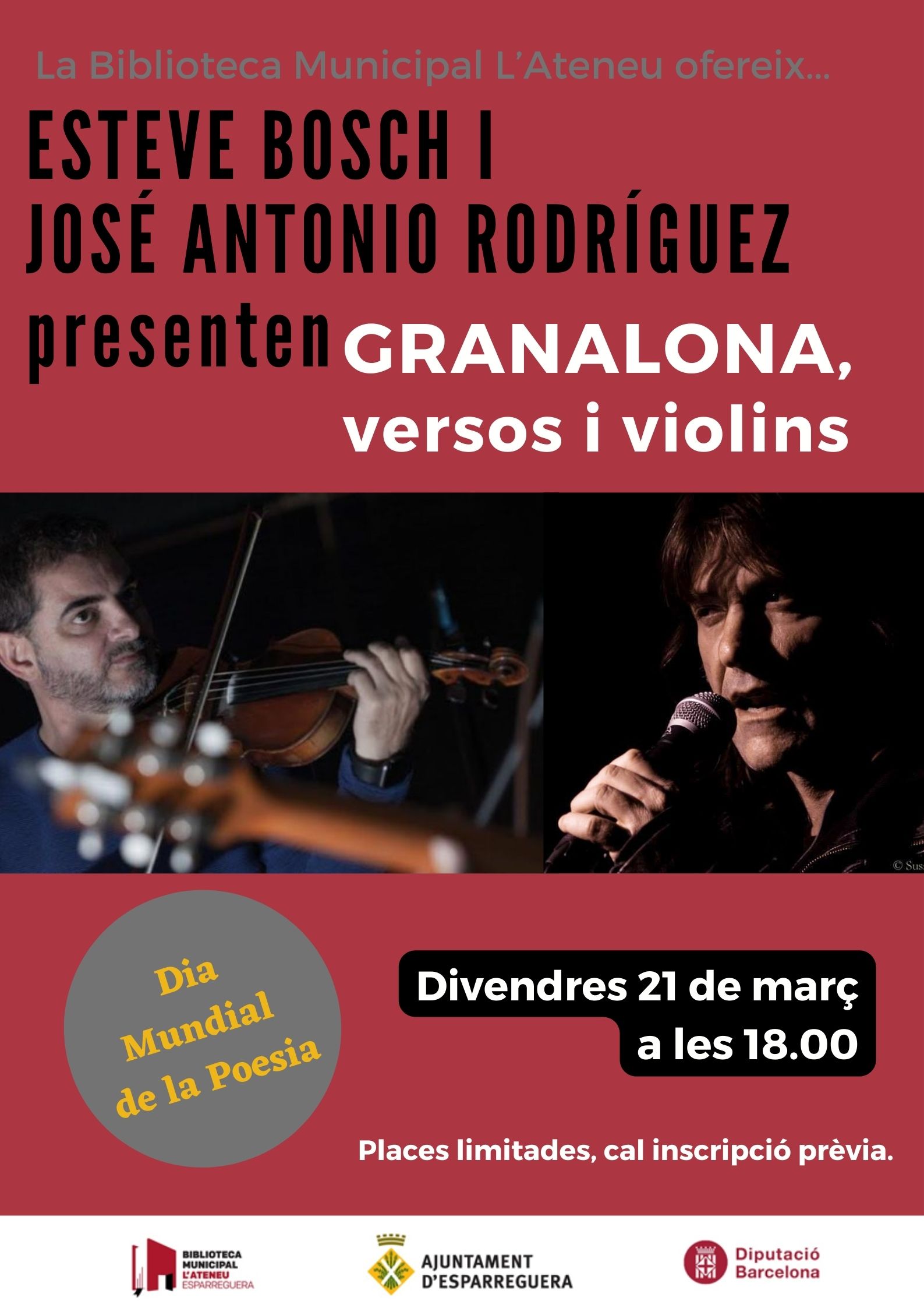 El 21 de març és el Dia Mundial de la Poesia i per a celebrar-lo, la Biblioteca ofereix l'espectacle de poesia i música "GRANALONA, versos i violins", a càrrec del poeta Esteve Bosch i el músic José Antonio Rodríguez. L'acte tindrà lloc el divendres a les 18.00 hores a la Sala d'actes de la Biblioteca.