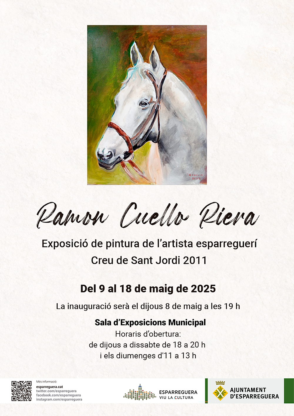 L'artista esparreguerí Ramon Cuello Riera farà una exposició de la seva obra pictòrica a la Sala d'Exposicions Municipal. La mostra, que està vinculada al món dels cavalls, s'inaugurarà el dijous 8 de maig a les 19 h i es podrà veure del 9 al 18 de maig.