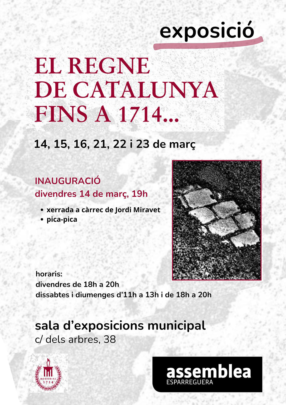 L'Assemblea d'Esparreguera organitza l'exposició "El regne de Catalunya fins a 1714" a la Sala d'Exposicions Municipal. La mostra s'inaugurarà divendres 14 de març a les 19 h amb una xerrada a càrrec de Jordi Miravet i un pica-pica.