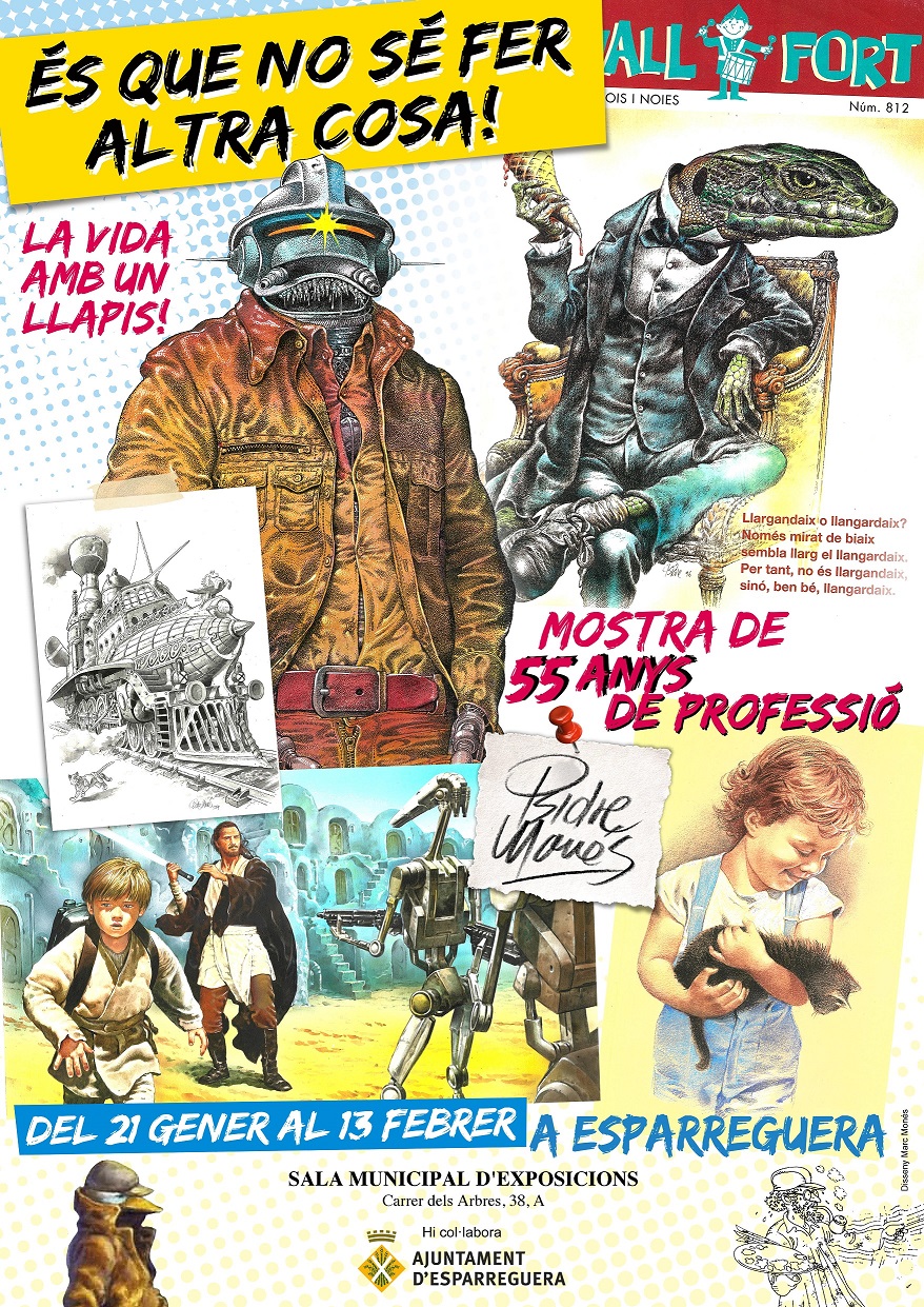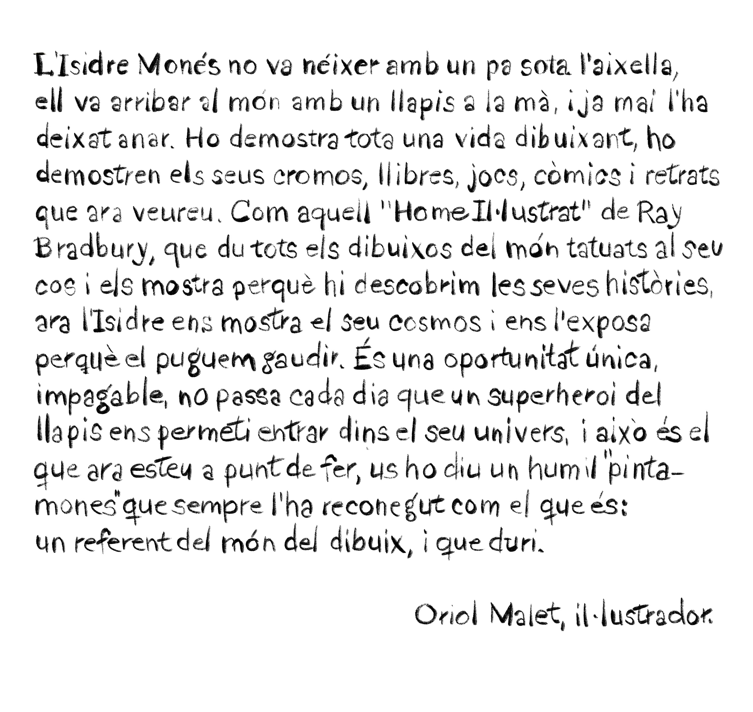 Exposició retrospectiva de l’il·lustrador Isidre Monés durant 55 anys de professió. S’hi podran veure tant treballs professionals publicats en còmics, llibres, cromos o jocs com els treballs més personals de l’artista.
