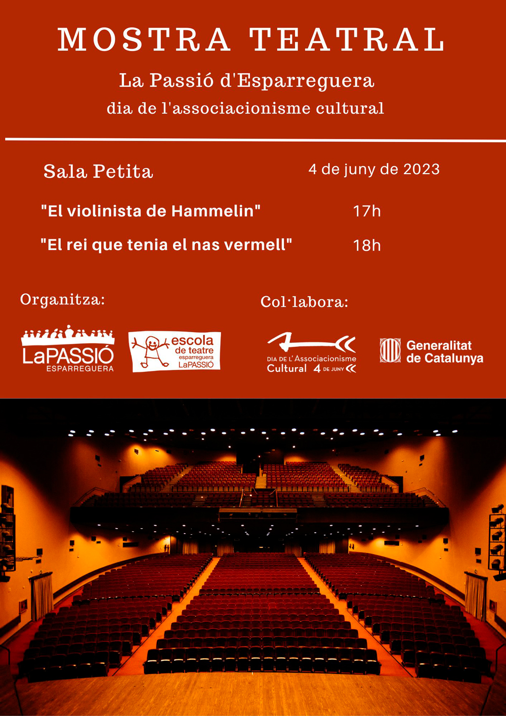 L’Escola de Teatre de La Passió d’Esparreguera organitza el seu final de curs amb 2 obres de teatre dels grups de petits, mitjans i joves. La Mostra coincidirà amb el Dia de l’Associacionisme Cultural, que es celebra cada any entre el 2 i el 12 de juny.
