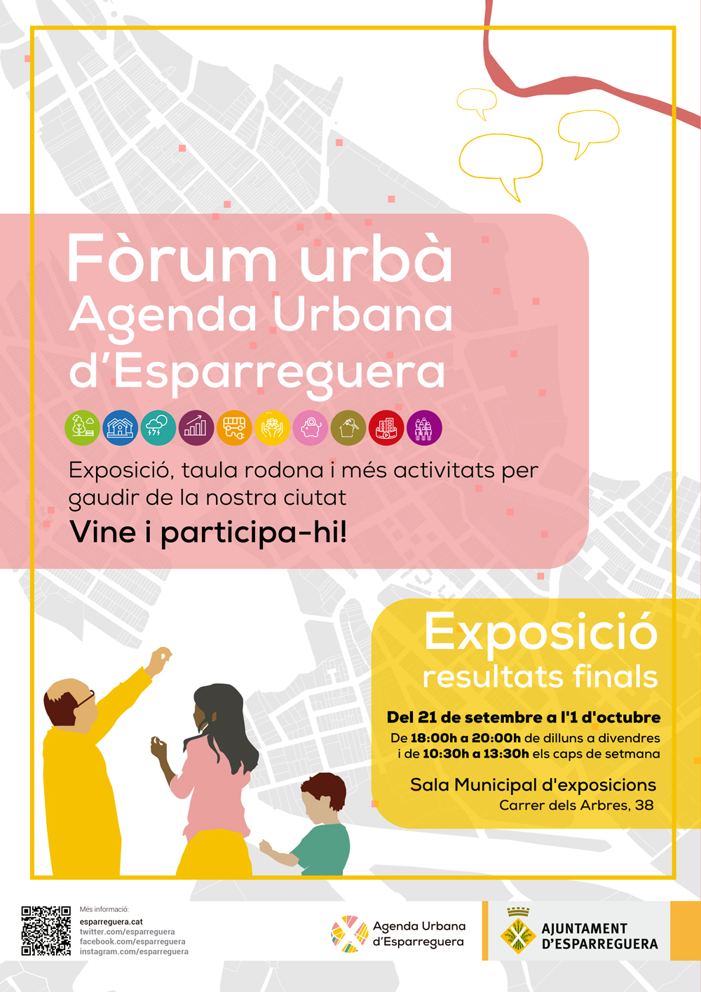 Entre els dies 21 de setembre i 1 d'octubre, s'exposaran pòsters amb dades, fotos i informació que recullen la informació més rellevant de l'Agenda Urbana, des de la diagnosi de la situació actual d'Esparreguera, el procés participatiu de redacció, els projectes estratègics prioritzats per la ciutadania i les accions futures, fins als espais de governança creats, com ara el comissionat de barris o els grups de treball al voltant dels projectes pilot.