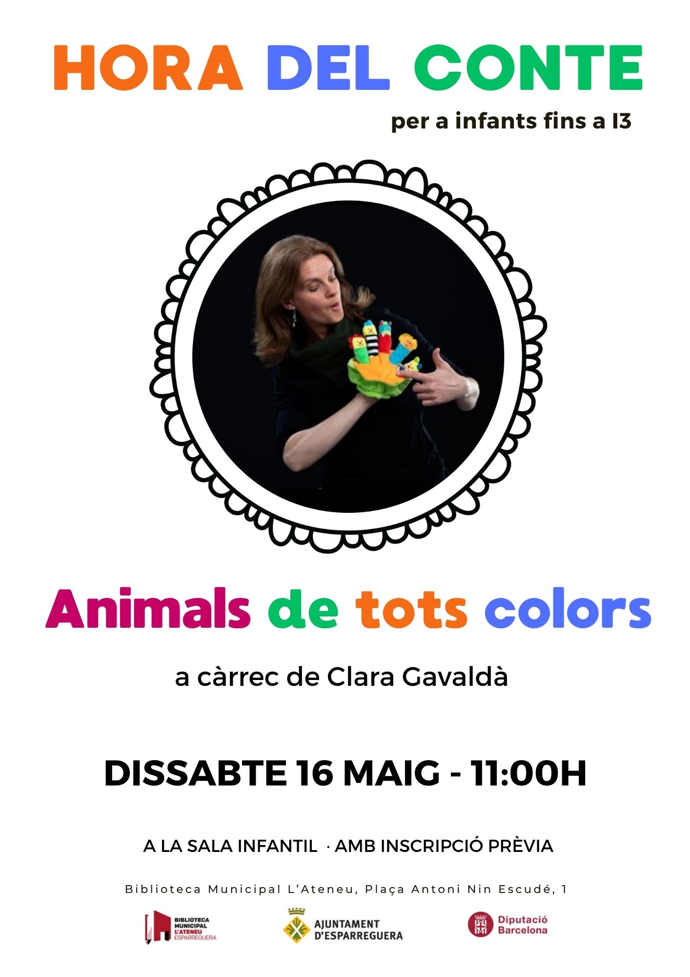 El dissabte 16 de miag, a les 11.00 h, la Biblioteca us ofereix l'Hora del conte "Animals de tots colors", a càrrec de la Clara Gavaldà. L'activitat està pensada per a infants fins a Infantil 3 (I3) acompanyats d'un adult.