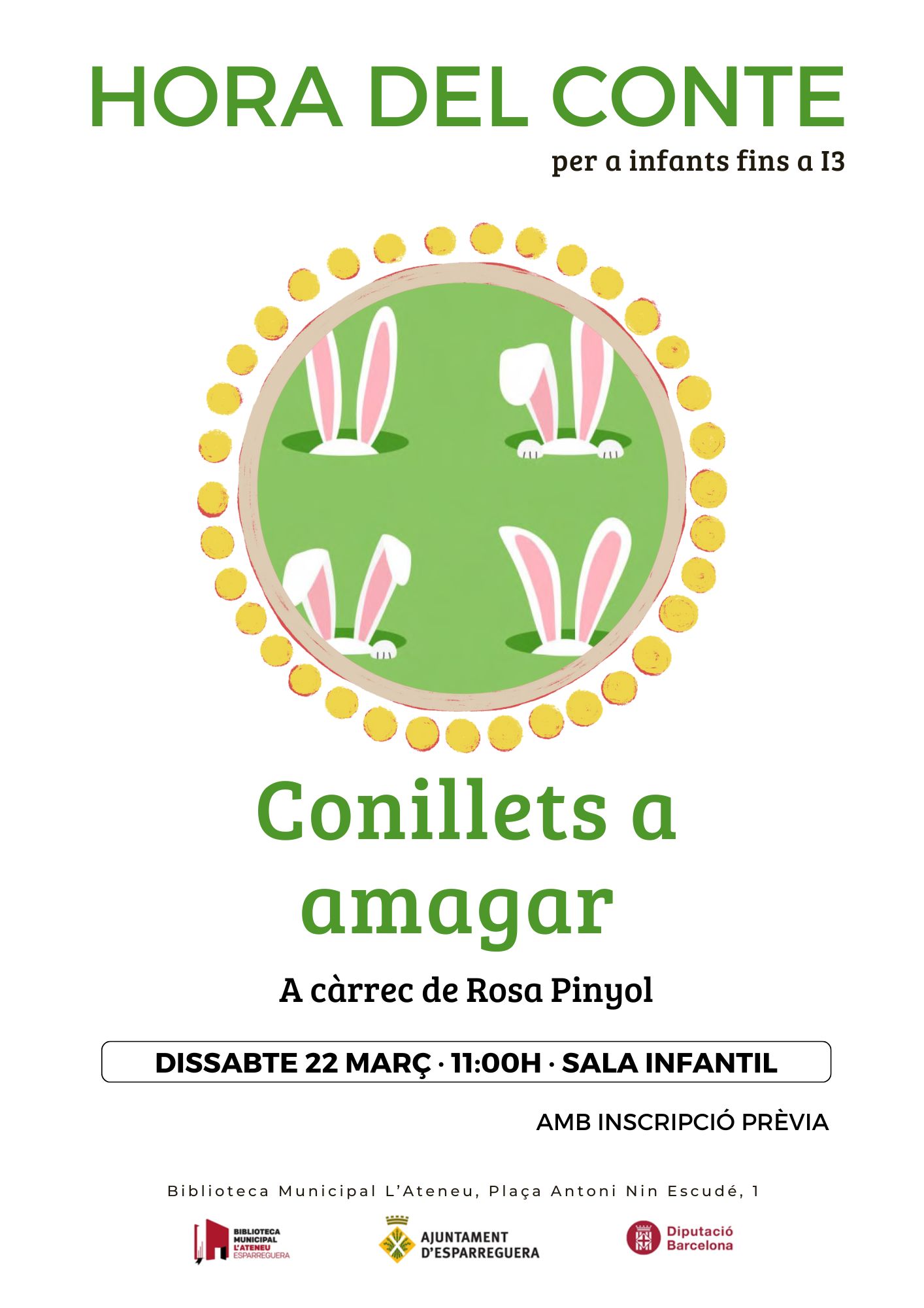 El dissabte 22 de març, a les 11.00 h, la Biblioteca acull l'Hora del conte per a nadons "Conillets a amagar". La Rosa Pinyol explicarà la història de tres conillets, que eren mooolt amics i sempre jugaven a cuit i amagar. On s’amagaven? Qui els perseguia? Ho feien, de nit o de dia? Xiiiist, conillets, que esteu ben amagadets? L'activitat està pensada per a infants fins a Infantil 3 (I3).