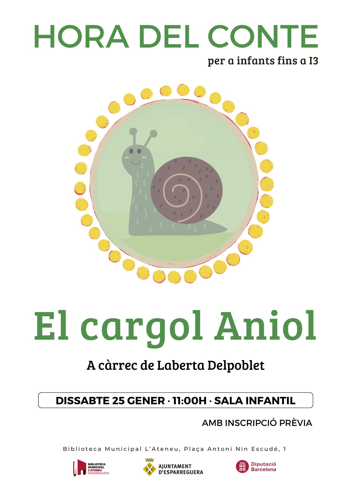 El dissabte 25 de gener, a les 11.00 h, la Biblioteca organitza una nova Hora del Conte per a nadons. Coneixerem la història d'"El cargol Aniol" de la mà de Laberta Delpoblet. L'activitat està indicada per a infants fins a I3.