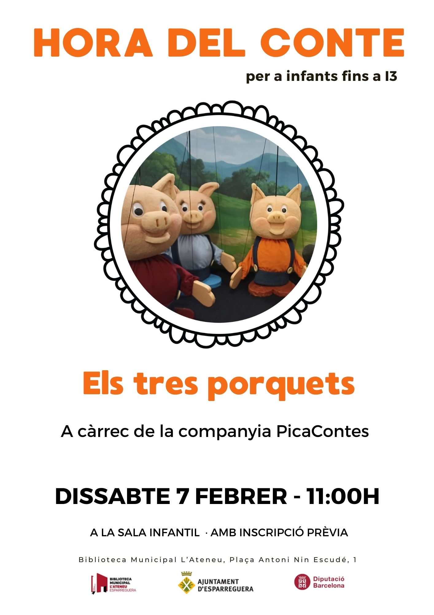 El dissabte 7 de febrer l'Hora del conte de nadons la dedicarem al clàssic "Els tres porquets" amb la companya PicaContes. Els tres germans porquets, l'Aran, el germà gran; en Roc, el germà mitjà, i la Greta, que és la germana més petita, hauran d'evitar que un llop se'ls mengi amb la construcció d'un refugi segur. La sessió està pensada per a infants fins a Infantil 3 (I3) acompanyats d'un adult.