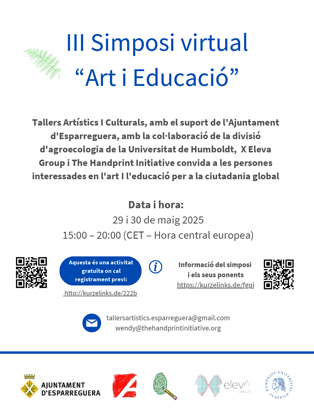 Responent a la necessitat de generar espais de reflexió i col·laboració que permetin consolidar estratègies educatives, que incloguin els Objectius de Desenvolupament Sostenible (ODS) i propiciar el compliment de l'agenda 2030, marcada per les Nacions Unides, els Tallers Artístics i Culturals d'Esparreguera, el Departament d'Agroecologia de la Universitat de Humboldt (Alemanya) i The Handprint Initiative (Mèxic-Barcelona) conviden les persones interessades a participar en dues jornades d'intercanvi d'experiències entre professionals internacionals, centrades en l'educació per a la ciutadania global i l'art com a eina transdisciplinària.