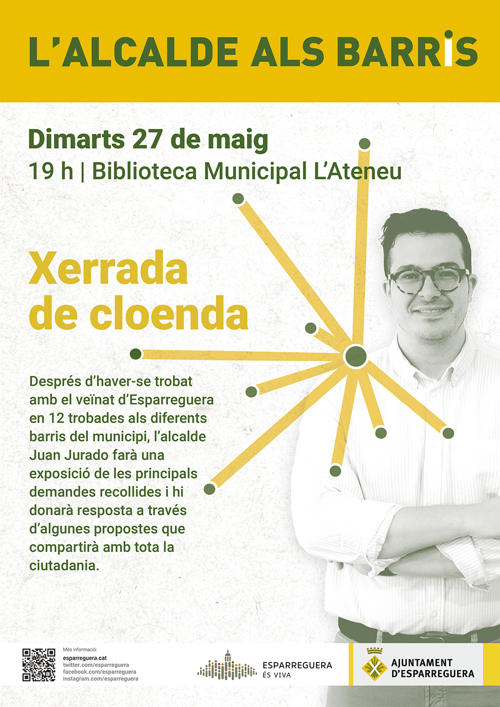 Després d’haver-se trobat amb el veïnat d’Esparreguera en 12 sessions als diferents barris del municipi, l’alcalde Juan Jurado farà una exposició de les principals demandes recollides i hi donarà resposta a través d’algunes propostes que compartirà amb tota la ciutadania. Serà en la xerrada de cloenda de l'Alcalde als barris, el dimarts 27 de maig, a les 19 h, a la Biblioteca Municipal l'Ateneu. L'acte és obert a tota la ciutadania.