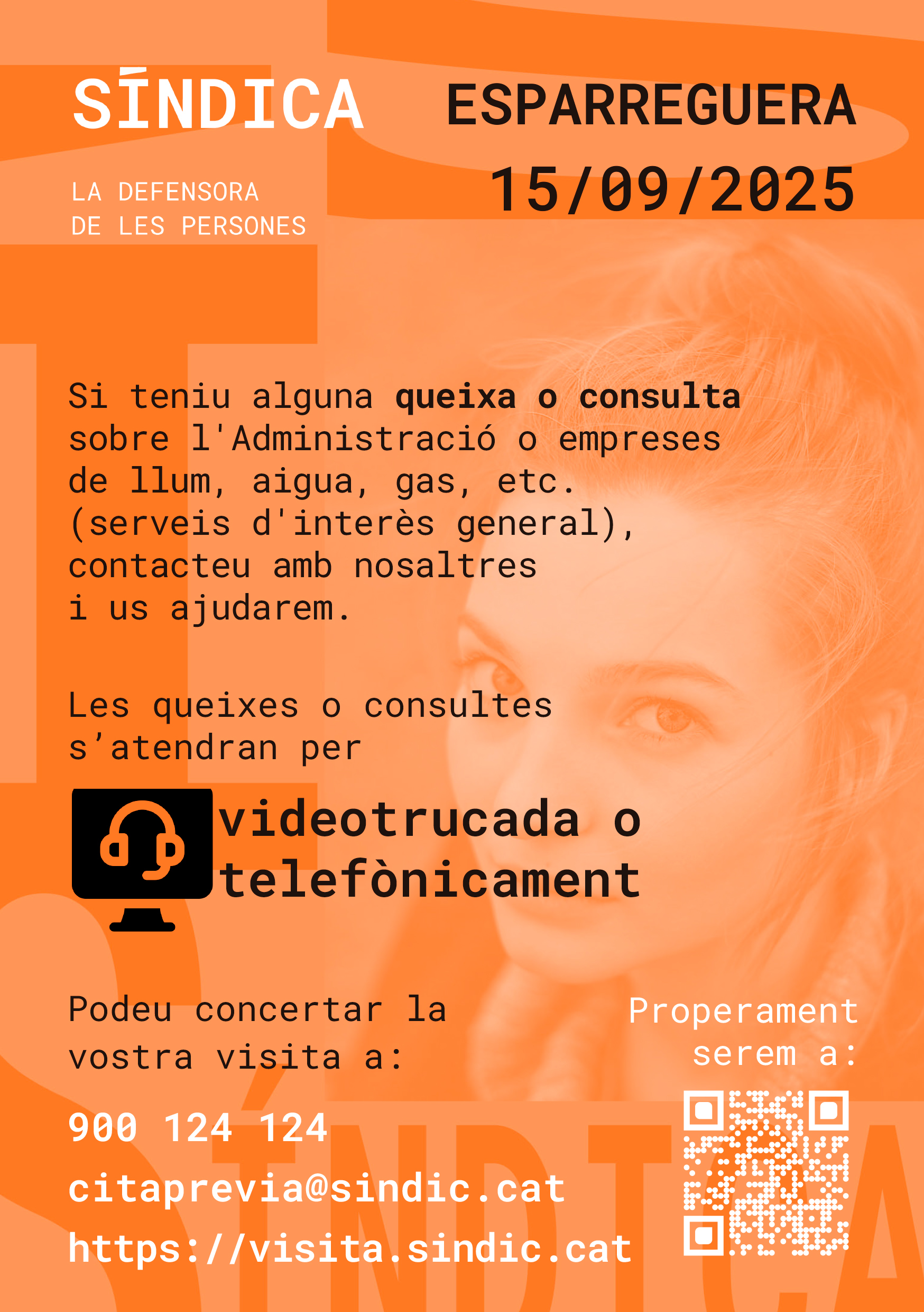 El dilluns 15 de setembre l'equip de la Síndica de Greuges de Catalunya serà a Esparreguera per atendre telemàticament les consultes o queixes dels veïns i veïnes del municipi.