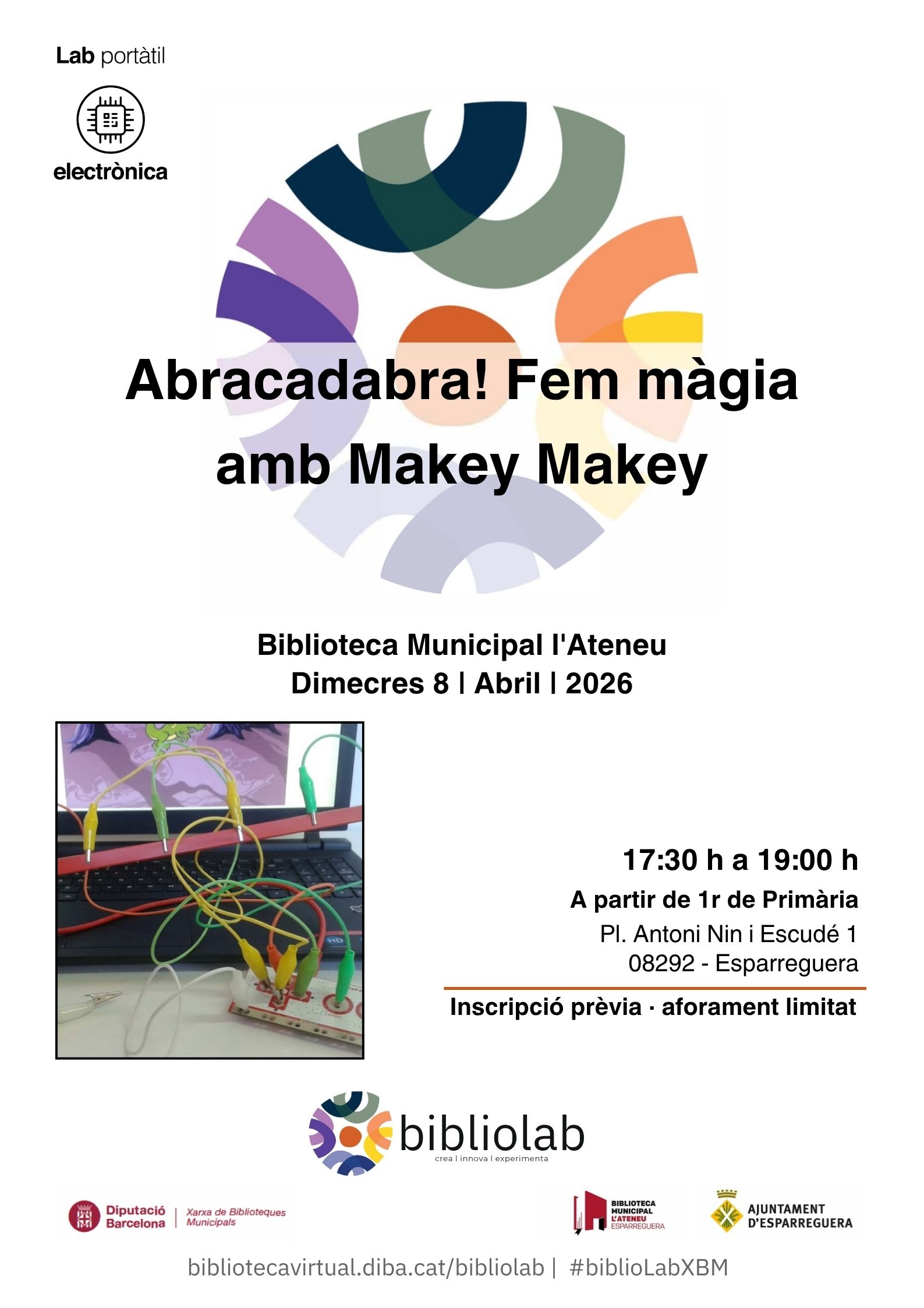 El dimecres 8 d'abril, a les 17.30 h, tindrà lloc el Lab d'electrònica "Abracadabra! Fem màgia amb Makey Makey". Utilitzarem els kits Makey Makey per llançar conjurs amb una vareta màgica i transformar el personatge en pantalla. L'activitat està pensada per a infants de 1r a 6è de Primària i tindrà una durada de 1h 30 min. El taller anirà a càrrec d'Eixos Creativa.