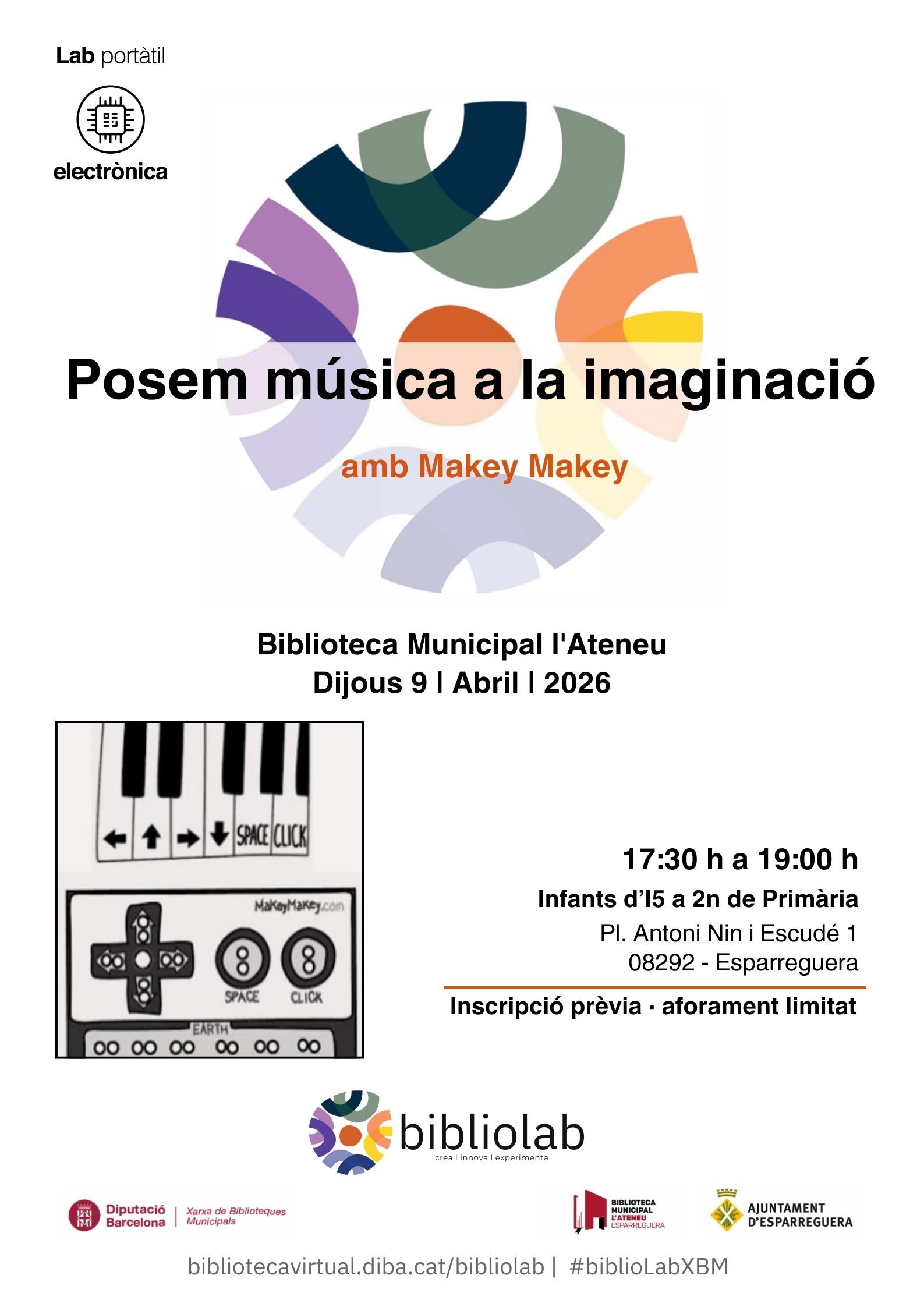 El dijous 9 d'abril us esperem al segon Lab d'electrònica per a infants de la Biblioteca Municipal L'Ateneu! En aquesta ocasió jugarem a ser músics creant el nostre instrument musical amb plaques Makey Makey. Els professionals d'Eixos Creativa introduiran els principis bàsics de la indústria 4.0 mitjançant la programació i posada en funcionament d’aplicacions basades en la interacció del món físic i digital. L'activitat tindrà lloc de 17.30 a 19 hores i està pensada per a infants des d'Infantil 5 (I5) fins a 2n de Primària.