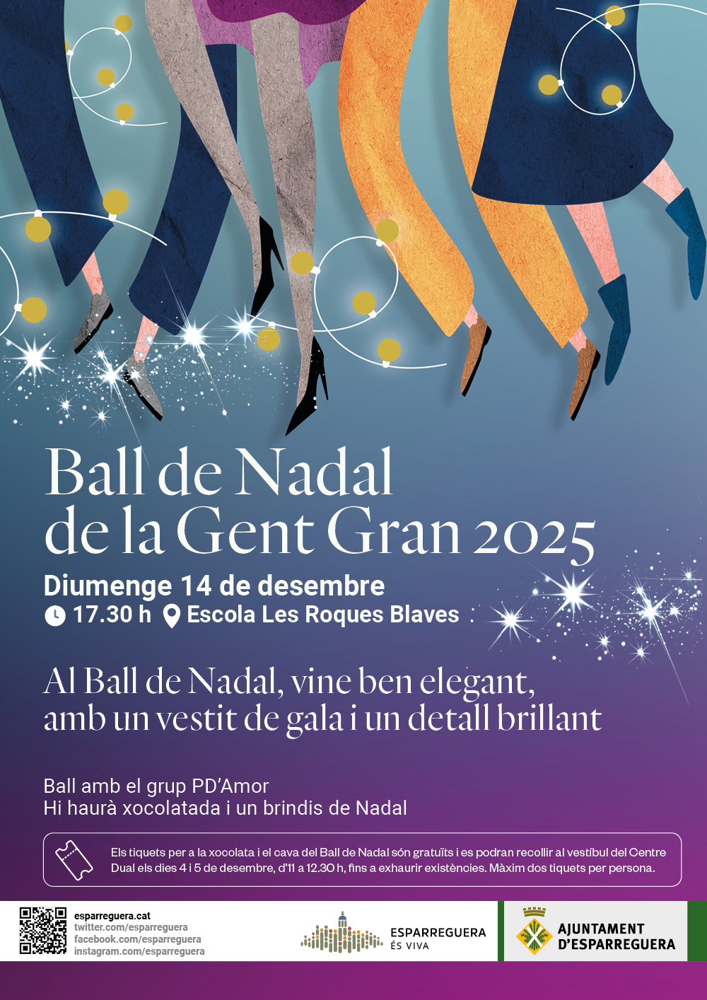 Els tiquets per a la xocolata i el cava del Ball de Nadal són gratuïts amb un màxim de 2 tiquets per persona. Es podran recollir al vestíbul del Centre Dual els dies 4 i 5 de desembre, d'11 a 12.30 h, fins a exhaurir existències.