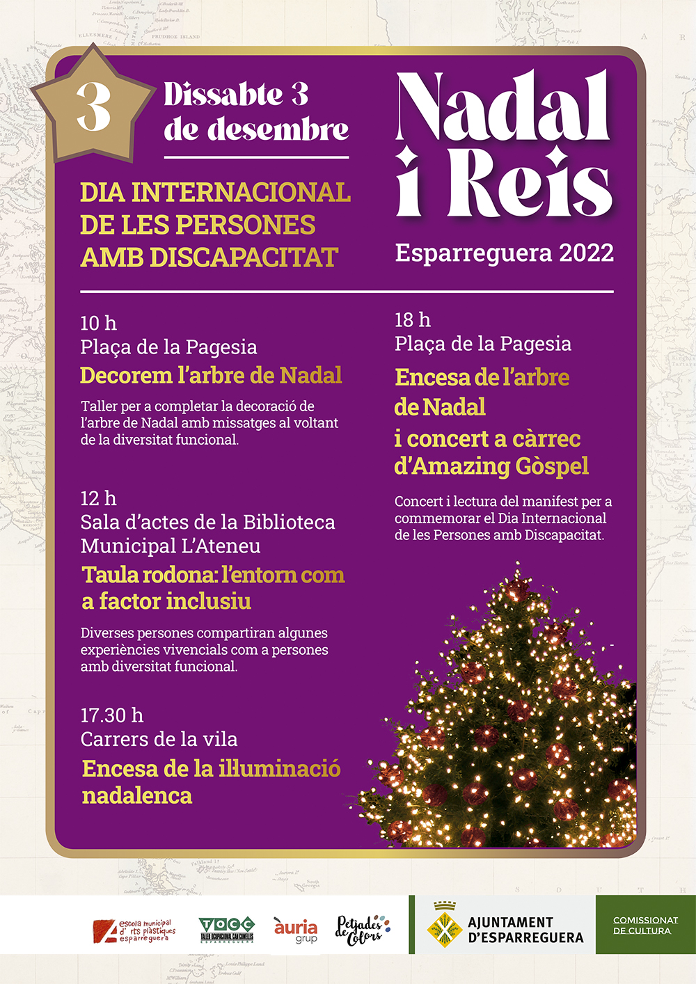 L'acte d'encesa de l’arbre de Nadal, ubicat a la plaça de la Pagesia, comptarà amb una intervenció artística que posa en relleu els desitjos i inquietuds de les persones amb diversitat funcional. A més, es farà una lectura del Manifest del Dia Internacional de les Persones amb Discapacitat a càrrec de les entitats participants.