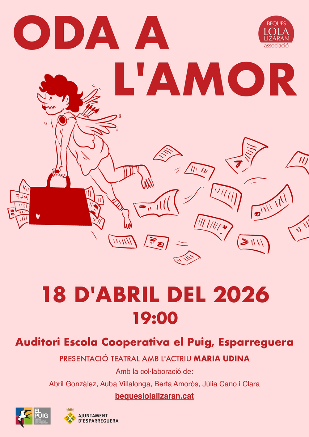 L’Associació Beques Lola Lizaran organitza la presentació teatral "Oda a l'amor" amb l'actriu Maria Udina i la col·laboració d'Abril González, Auba Villalonga, Berta Amorós, Júlia Cano i Clara. L'espectacle tindrà lloc el dissabte 18 d'abril a les 19 h a l'auditori de l'Escola Cooperativa El Puig.