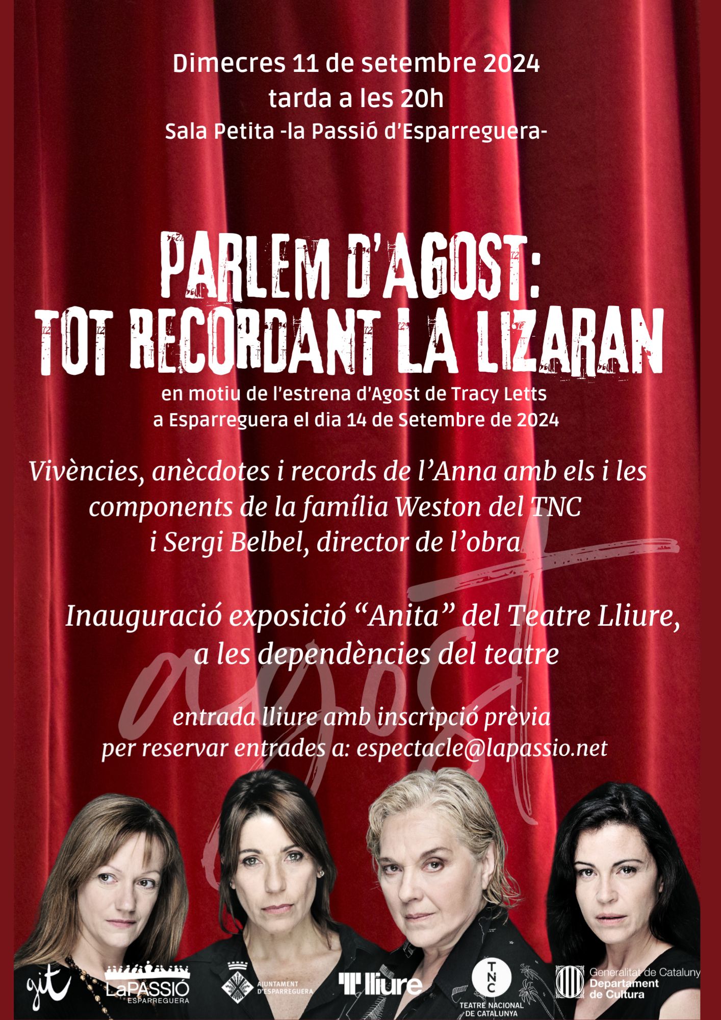 Aquest primer acte el fem centrat amb Agost, obra que va fer l’actriu sota la direcció de Sergi Belbel al TNC. Vivències, anècdotes i records de l’Anna amb els i les components de la companyia i amb Sergi Belbel, director de l’obra. Aquest acte inaugurarà l’exposició Anita, realitzada pel Teatre Lliure a les dependències de la Sala Petita de La Passió.
