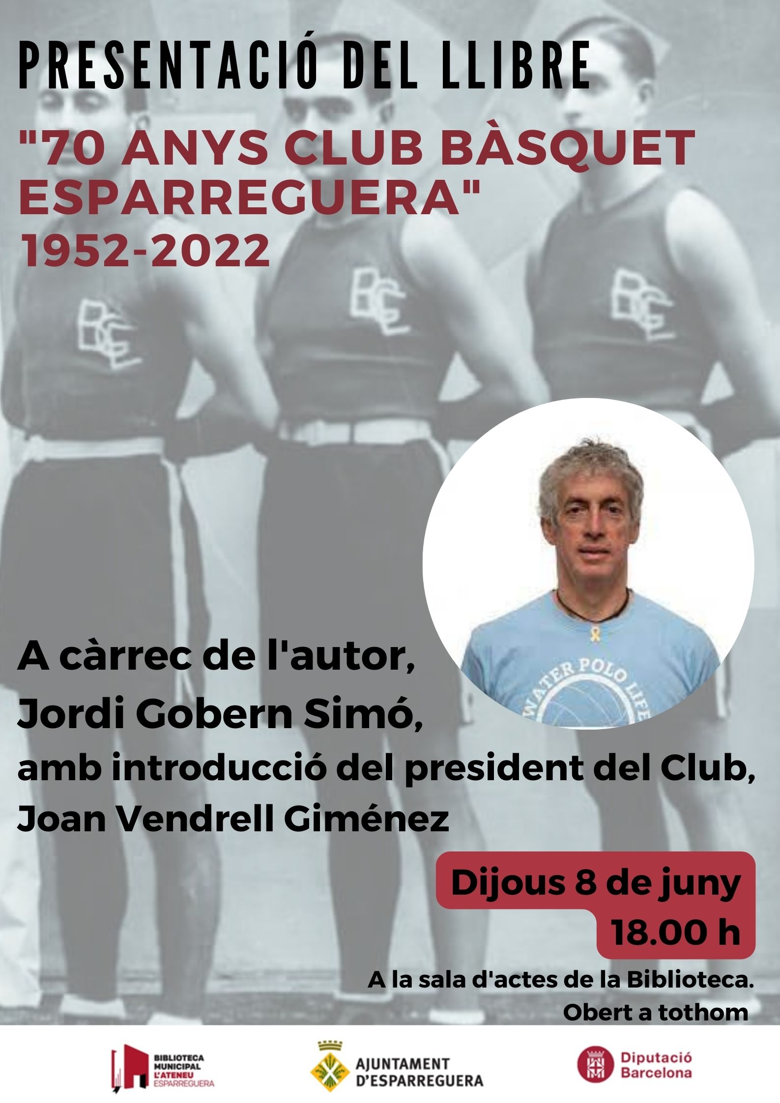 El dijous 8 de juny la Biblioteca acollirà la presentació del llibre "70 anys del Club Bàsquet Esparreguera.1952-2022", a càrrec de Jordi Gobern Simó, autor de l'obra, i de Joan Vendrell Giménez, president del club esparreguerí. L'acte tindrà lloc a la Sala d'actes a les 18 hores.