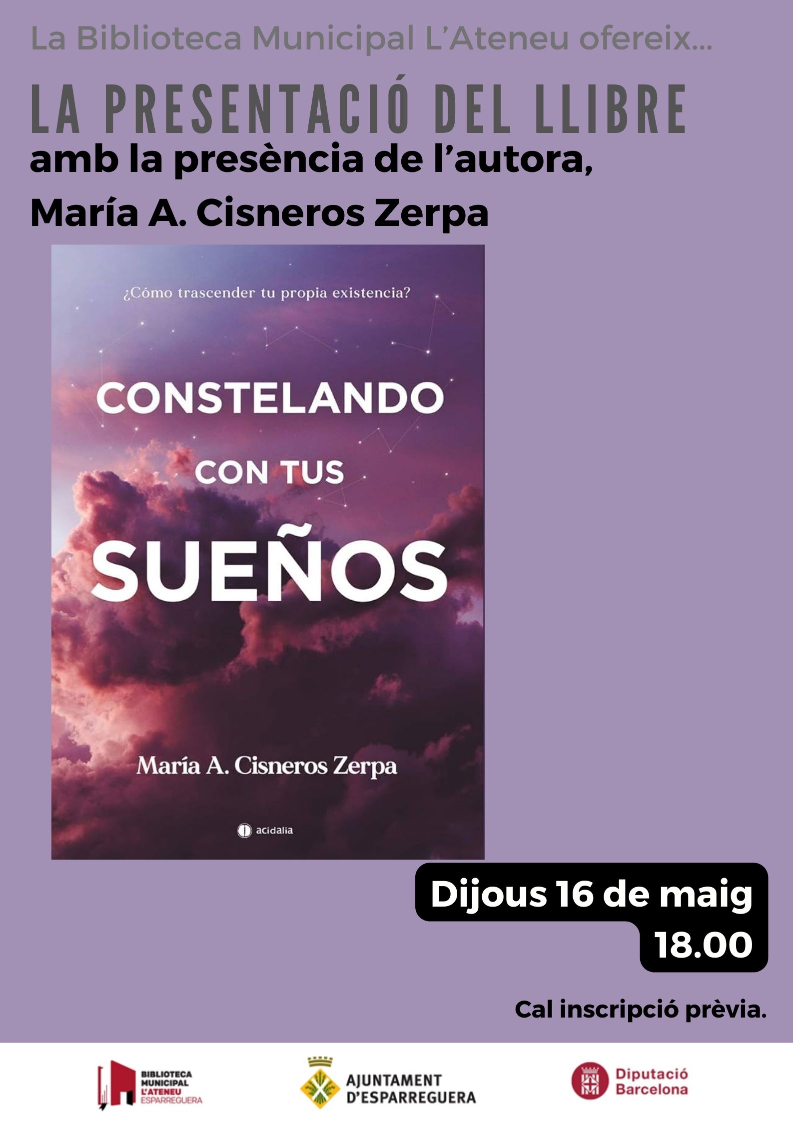 El dijous 16 de maig la Biblioteca acull la presentació del llibre "Constelando con tus sueños", a càrrec de María A. Cisneros, autora de l'obra.