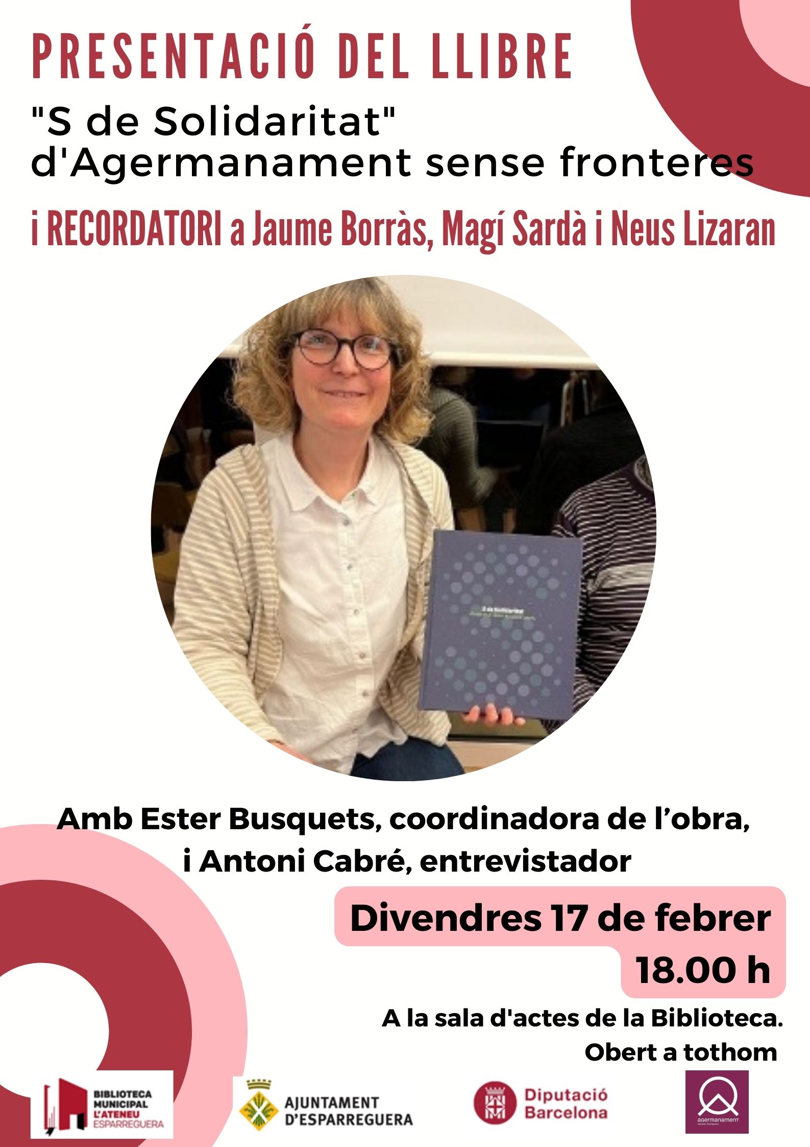 La Biblioteca acull la presentació del llibre "S de Solidaritat", d'Agermanament sense Fronteres, una obra col·lectiva que recull 42 aforismes relacionats amb la solidaritat. La presentació comptarà amb Ester Busquets, coordinadora de l'obra, i Antoni Cabré, que presentarà l'acte.