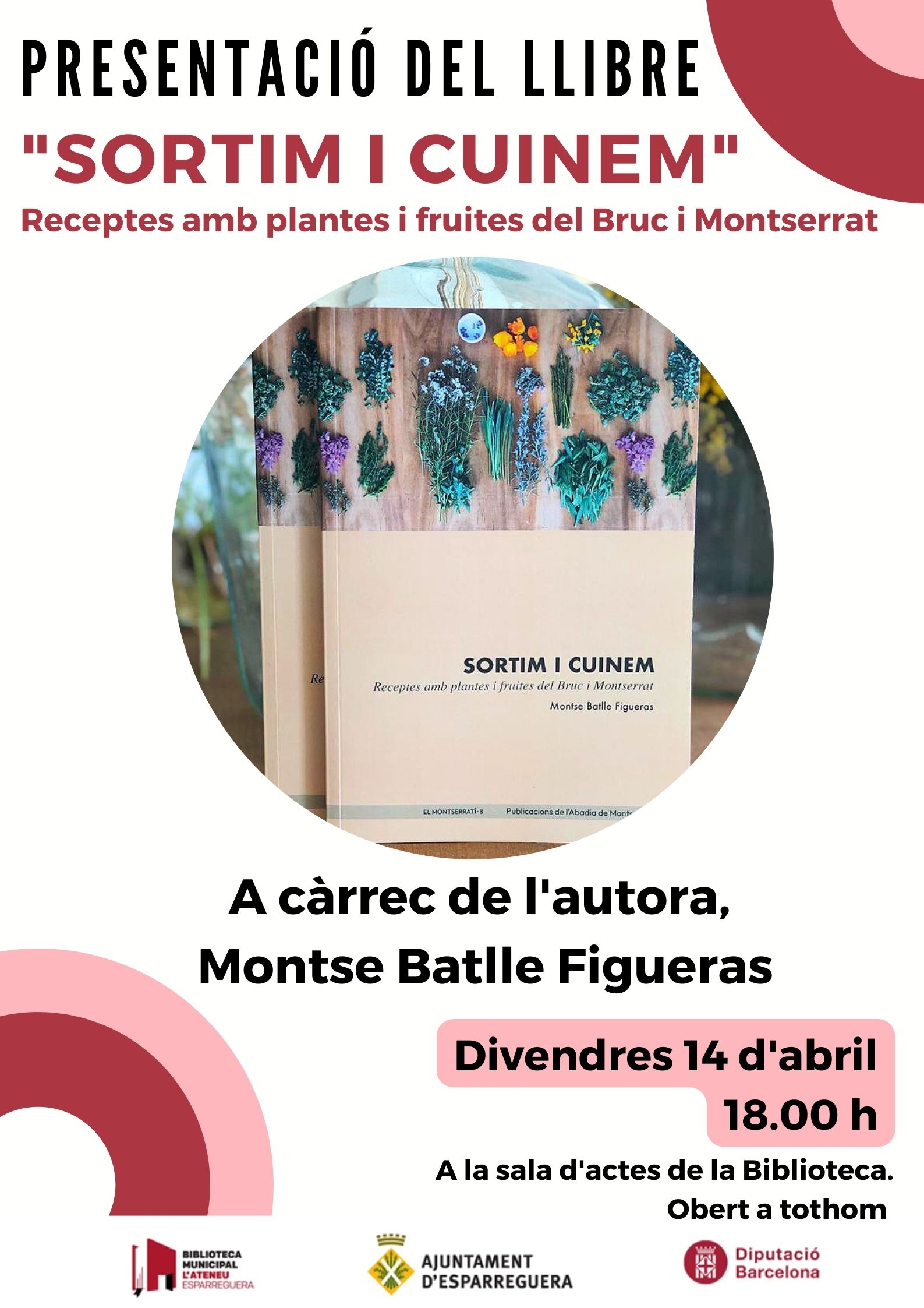 El divendres 14 la Biblioteca acull la presentació del llibre "Sortim i cuinem. Receptes amb plantes i fruites del Bruc i Montserrat", a càrrec de l'autora Montse Batlle Figueras. L'acte tindrà lloc a les 18 hores a la Sala d'actes.