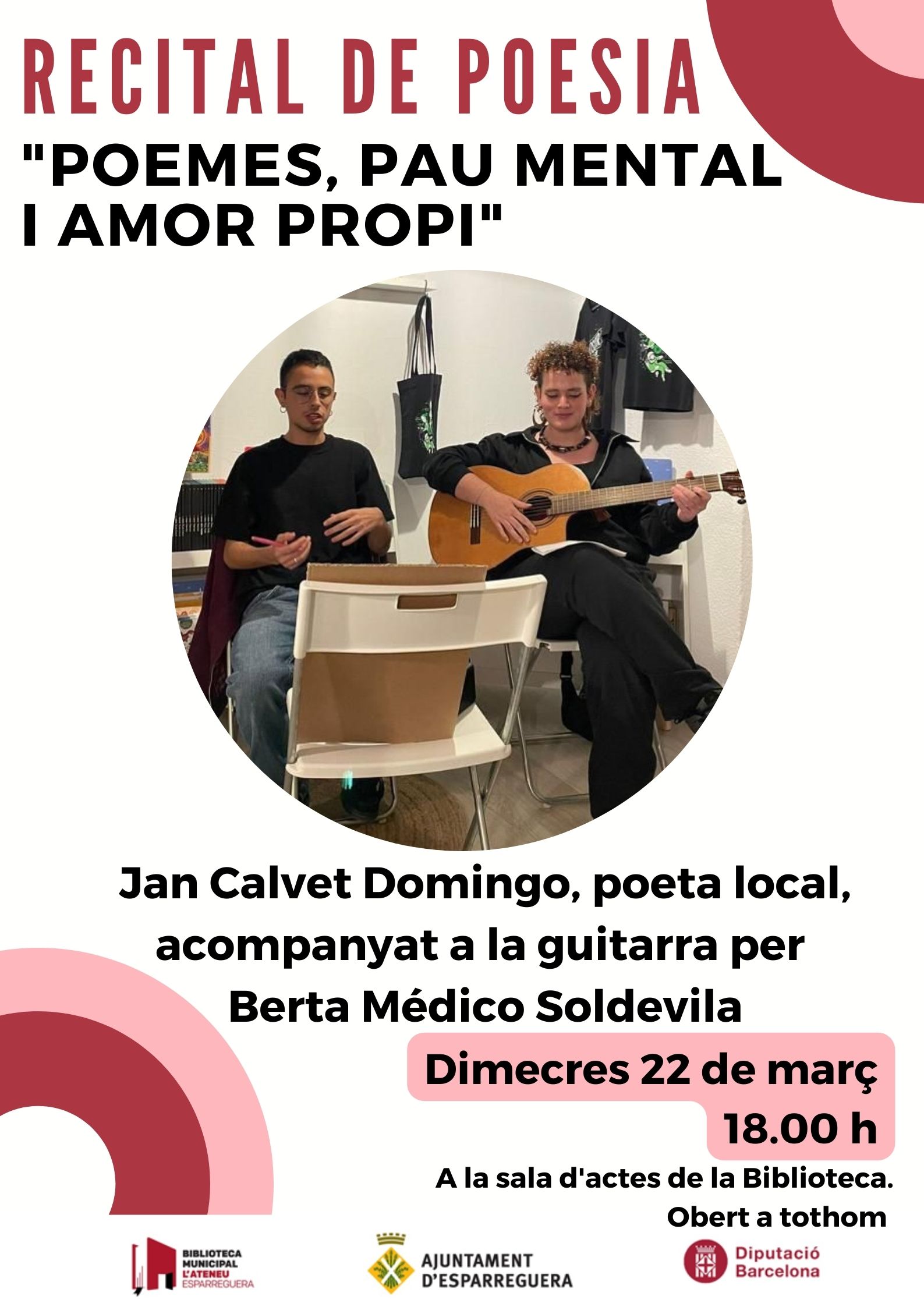 El dimecres 22 de març la Biblioteca celebra el Dia de la Poesia amb el recital "Poemes, pau mental i amor propi", a càrrec del poeta local Jan Calvet Domingo, acompanyat a la guitarra per Berta Médico Soldevila. L'activitat tindrà lloc a les 18.00 hores a la Sala d'actes de la Biblioteca.
