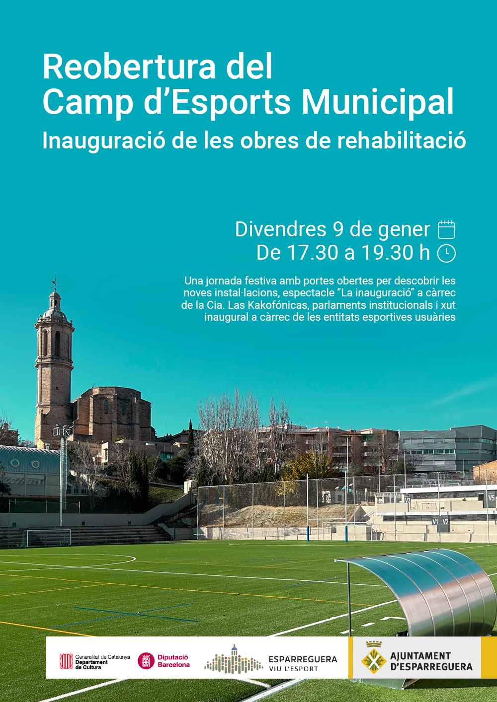 El divendres 9 de gener, a les 17.30 h, tindrà lloc la reobertura del Camp d'Esports Municipal amb la inauguració de les obres de rehabilitació d'aquest equipament. Serà una jornada festiva amb portes obertes per descobrir les noves instal·lacions, l'espectacle “La inauguració” a càrrec de la Cia. Las Kakofónicas, parlaments institucionals i xut inaugural a càrrec de les entitats esportives usuàries.