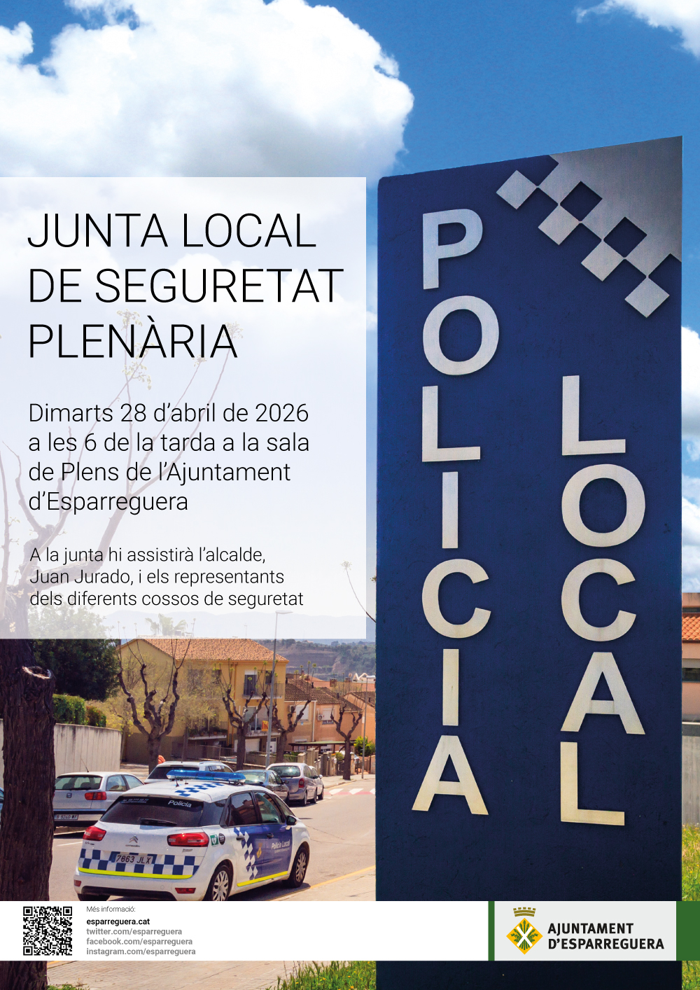 La Junta de Seguretat es reunirà el dimarts 28 d'abril en sessió ordinària a les 17.30 h i en sessió plenària a les 18 h a la sala de Plens de l'Ajuntament. L'acte comptarà amb la presència de l'alcalde, Juan Jurado, i els representants dels diferents cossos de seguretat, la Policia Local, els Mossos d’Esquadra, els Bombers de la Generalitat, la Guàrdia Civil i la Policia Nacional.