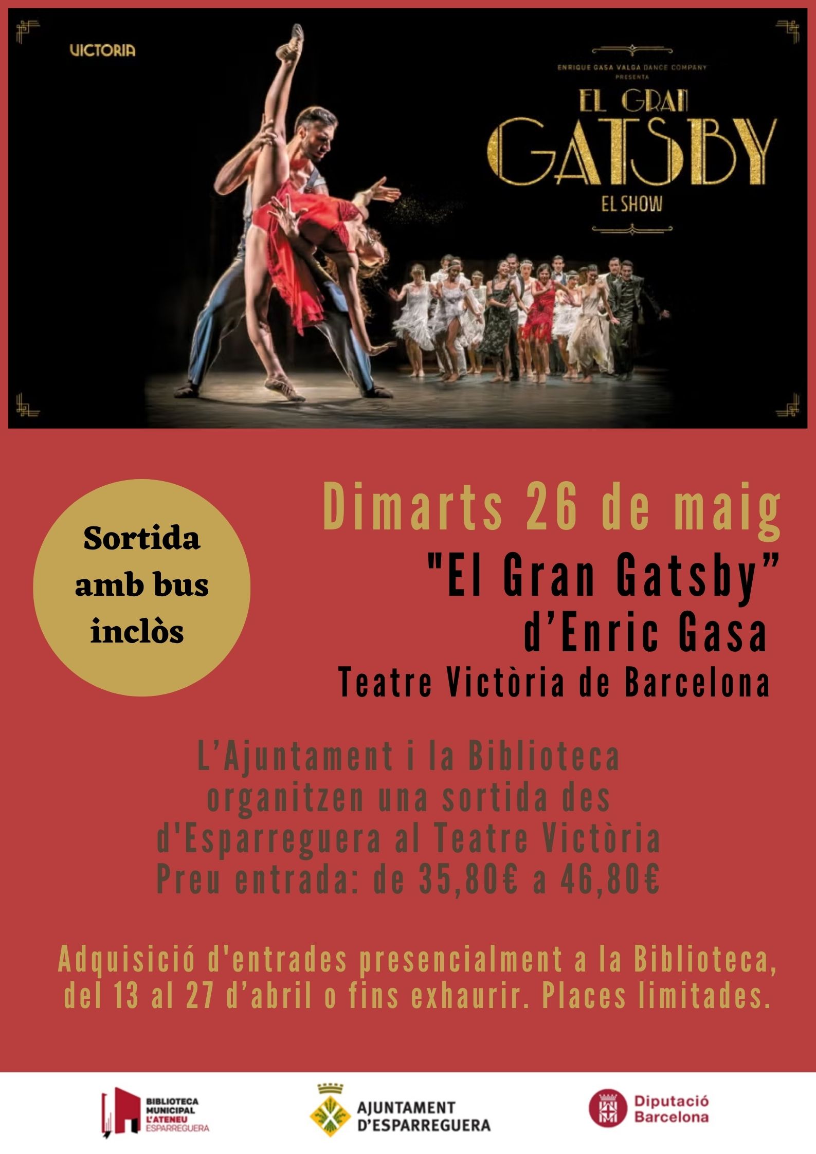 L'Ajuntament d'Esparreguera i la Biblioteca Municipal organitzen una sortida el dimarts 26 de maig per anar a veure "El gran Gatsby" al Teatre Victòria de Barcelona. L'espectacle, del coreògraf esparreguerí Enric Gasa, és una adaptació de la novel·la d'F. Scott Fitzgerald. Les inscipcions i venda d'entrades s'iniciaran el dilluns 13 d'abril a les 15.00 h presencialment a la Biblioteca, fins exhaurir places.