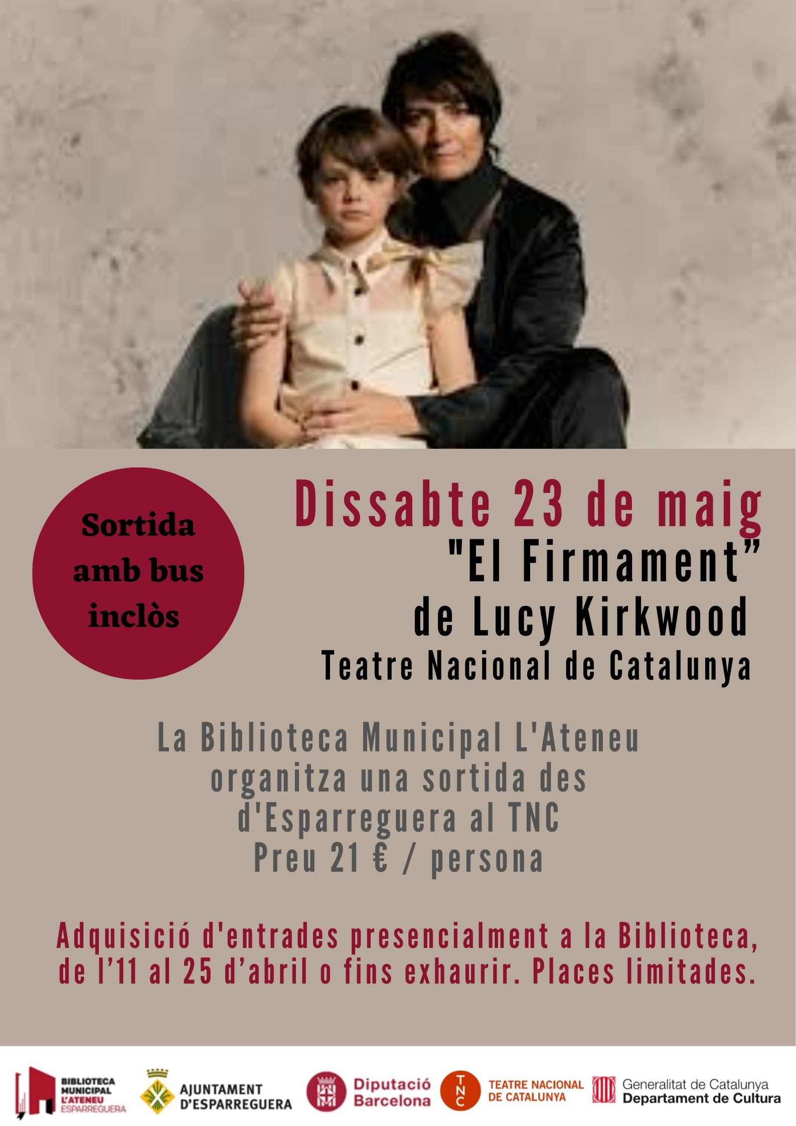 El dissabte 23 de maig la Biblioteca organitza una sortida al TNC per gaudir de l'obra de teatre "El firmament", de Lucy Kirkwood. Les inscipcions i venda d'entrades s'iniciaran el dissabte 11 d'abril a les 10.00 h presencialment a la Biblioteca, fins exhaurir places.