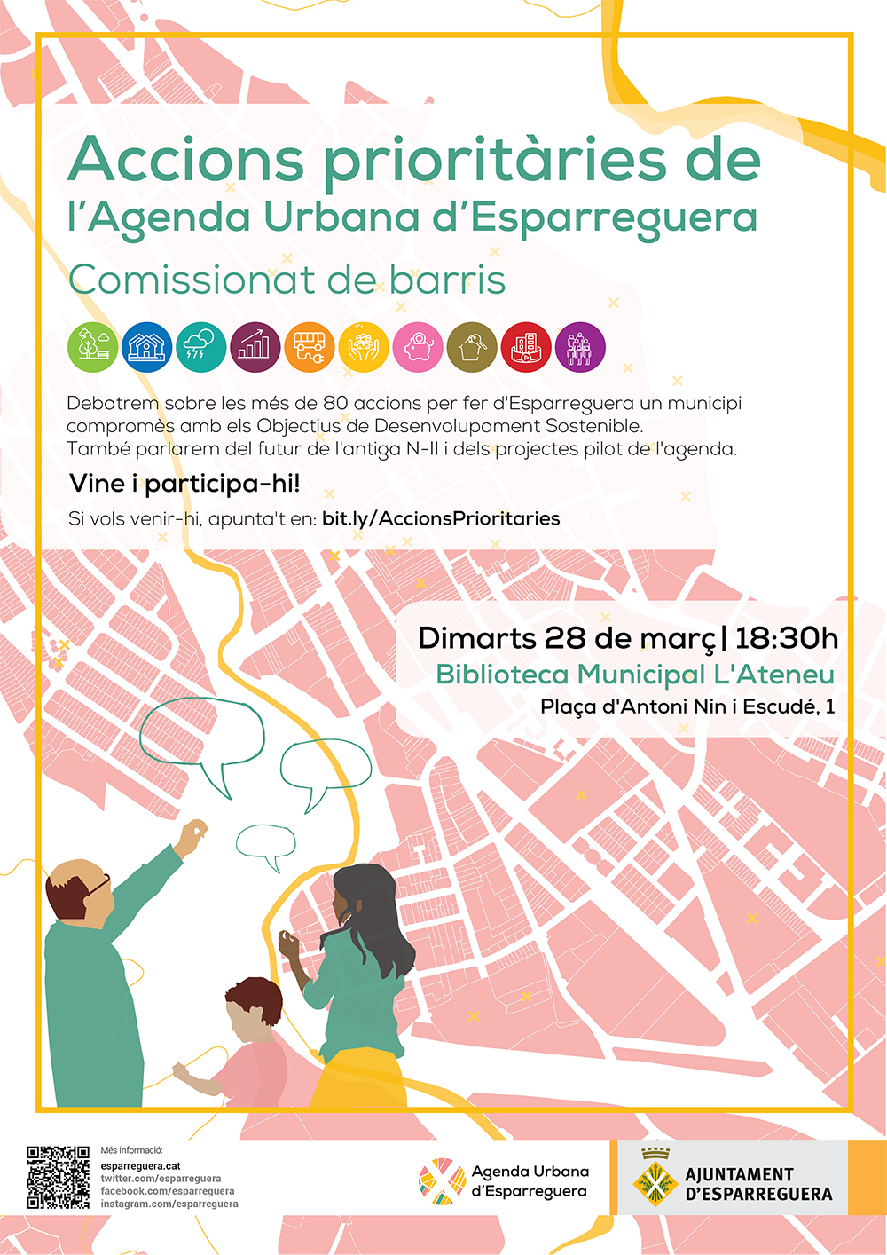 El dimarts 28 de març hi haurà una nova sessió del Comissionat de Barris per a decidir les accions prioritàries de l'Agenda Urbana d'Esparreguera. Serà un taller on es decidiran les accions a desenvolupar per tal que Esparreguera esdevingui un municipi més sostenible i inclusiu. En aquesta sessió també es parlarà del futur de l'antiga N-II i dels projectes pilot de l'agenda urbana.