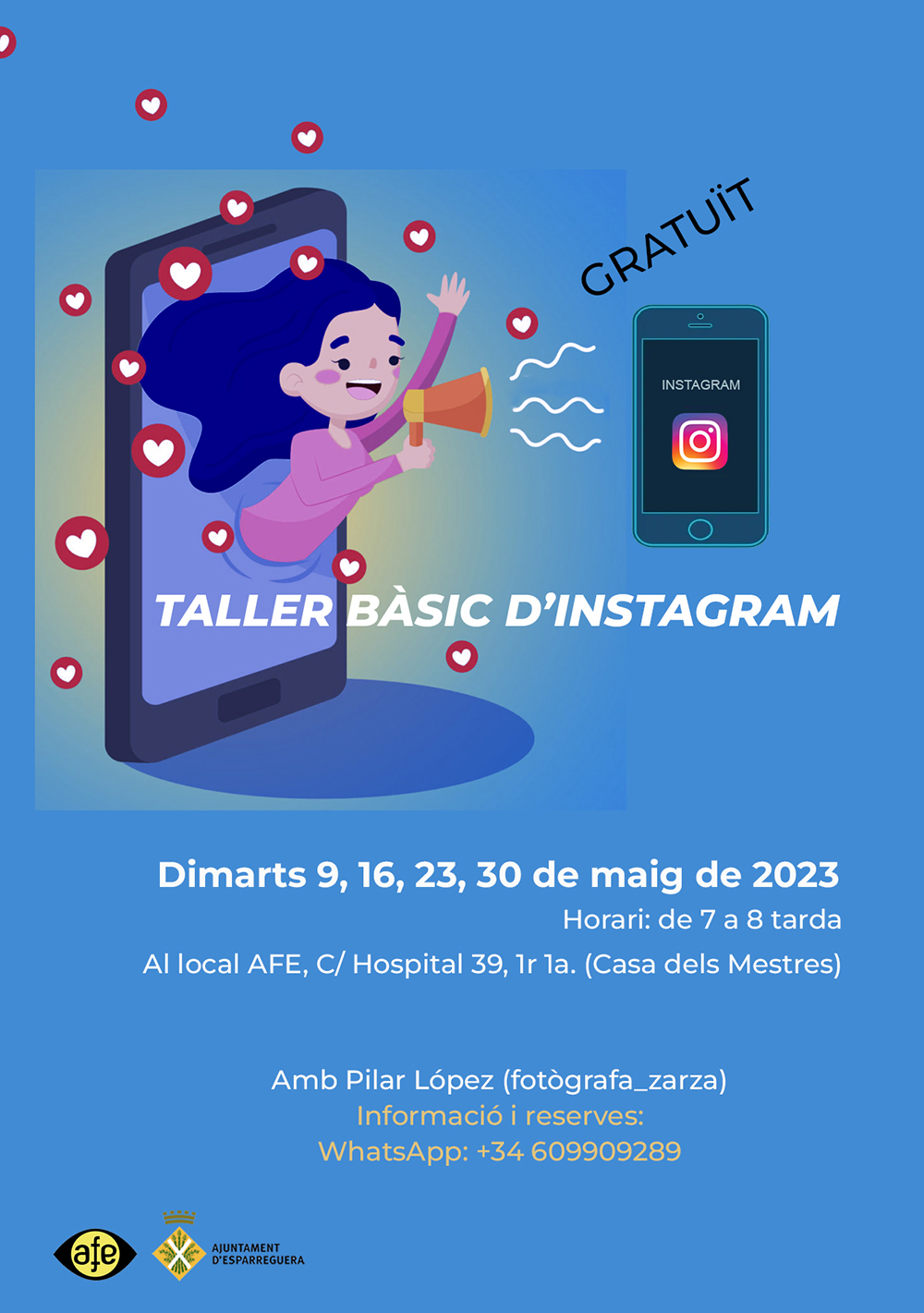 L'Associació Fotogràfica d'Esparreguera (AFE) organitza un Taller bàsic de creació i manteniment d'un compte d'Instagram.El curs es farà els dimarts 9, 16, 23 i 30 de maig de 19 a 20 h al local de l'AFE, al primer pis de la Casa dels Mestres, al carrer de l'Hospital, 39.